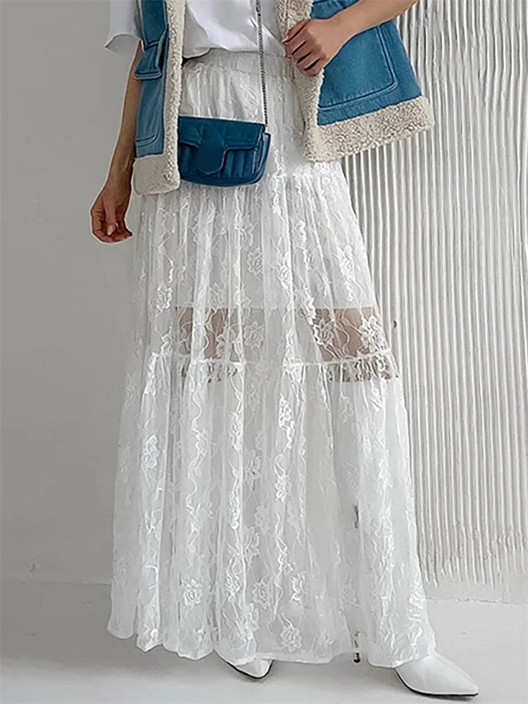 White Printed Lace Maxi Skirt For Women High Waist Fashion See-Through Patchwork Summer Fashion Ladies Long Skirt New