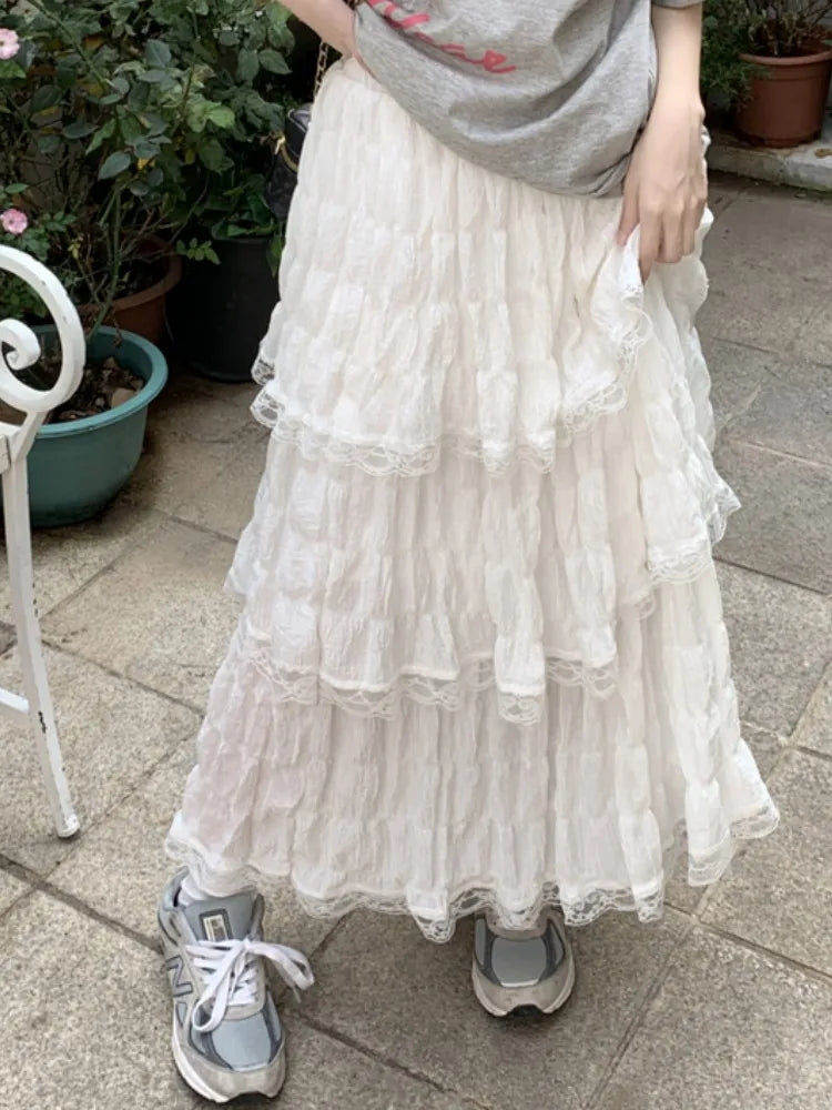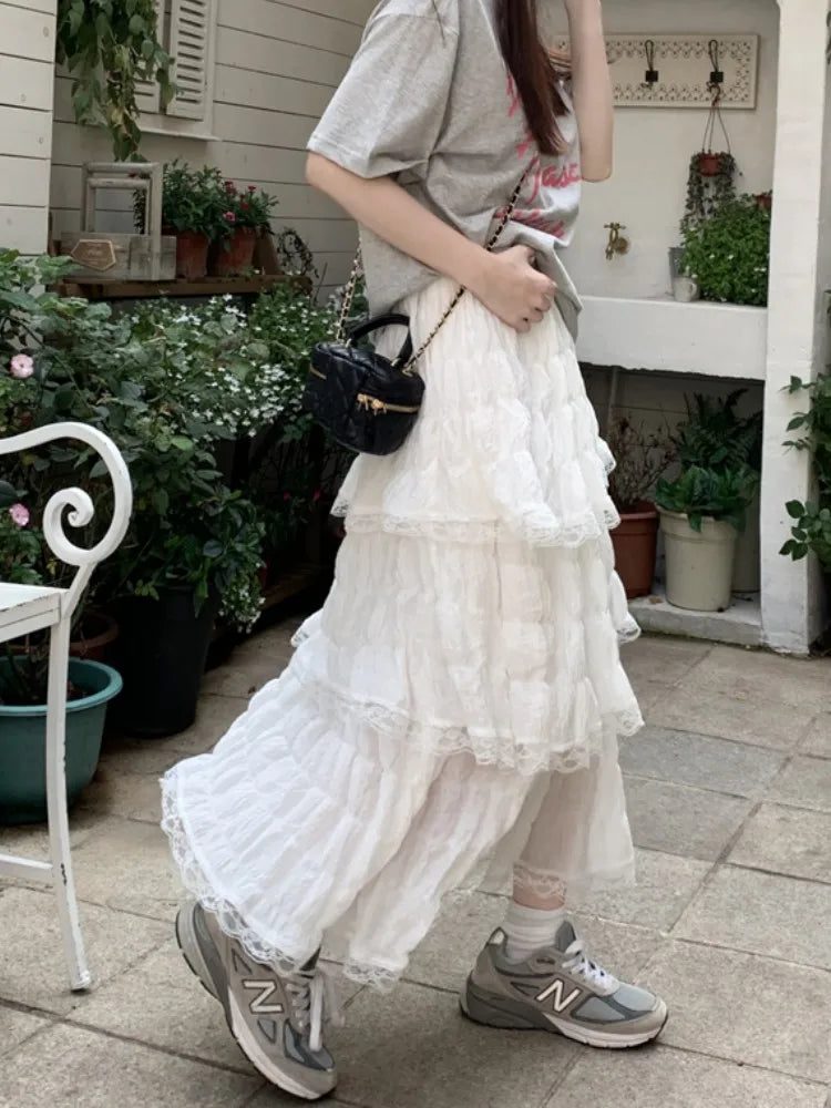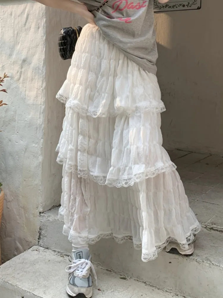 White Black Long Skirt Women Crochet Lace Skirt Goth Lolita Summer High Waisted High Low Ruched Ruffle Pleated Skirts rok