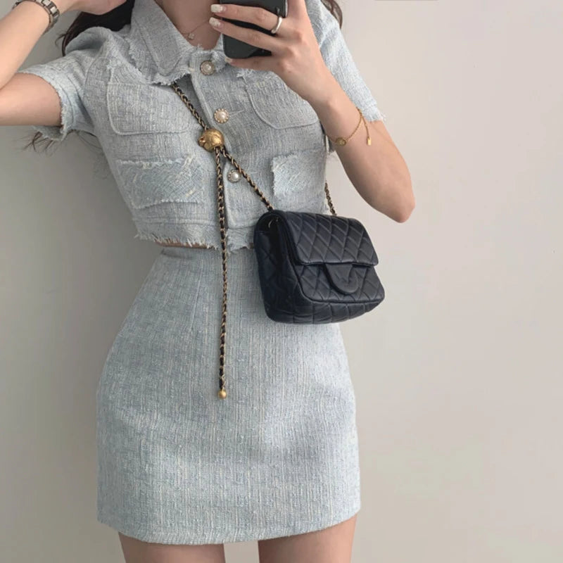 Women Summer Two 2 Piece Set Korean Style Elegant Single Breasted Tassel Short Sleeve Tops and High Waist Bodycon Mini Skirt
