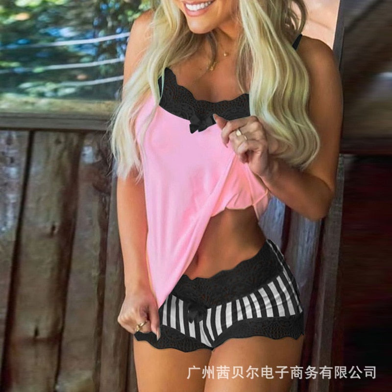 WEPBEL Lace Sleevelss Vest Tops Mini Shorts Sets Women Pajamas Set Pink Home Leisure Female Shorts Suits Sexy Sleepwear