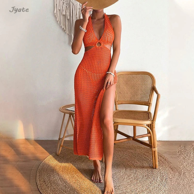 Bikini Swimming Cover-ups Women Slit Hollow Out Backless Lace-up Sexy Summer Long Dress V-neck Sleeveless Vacation Vestidos