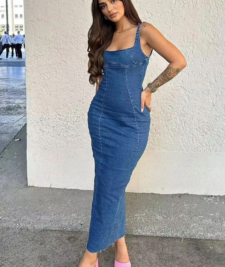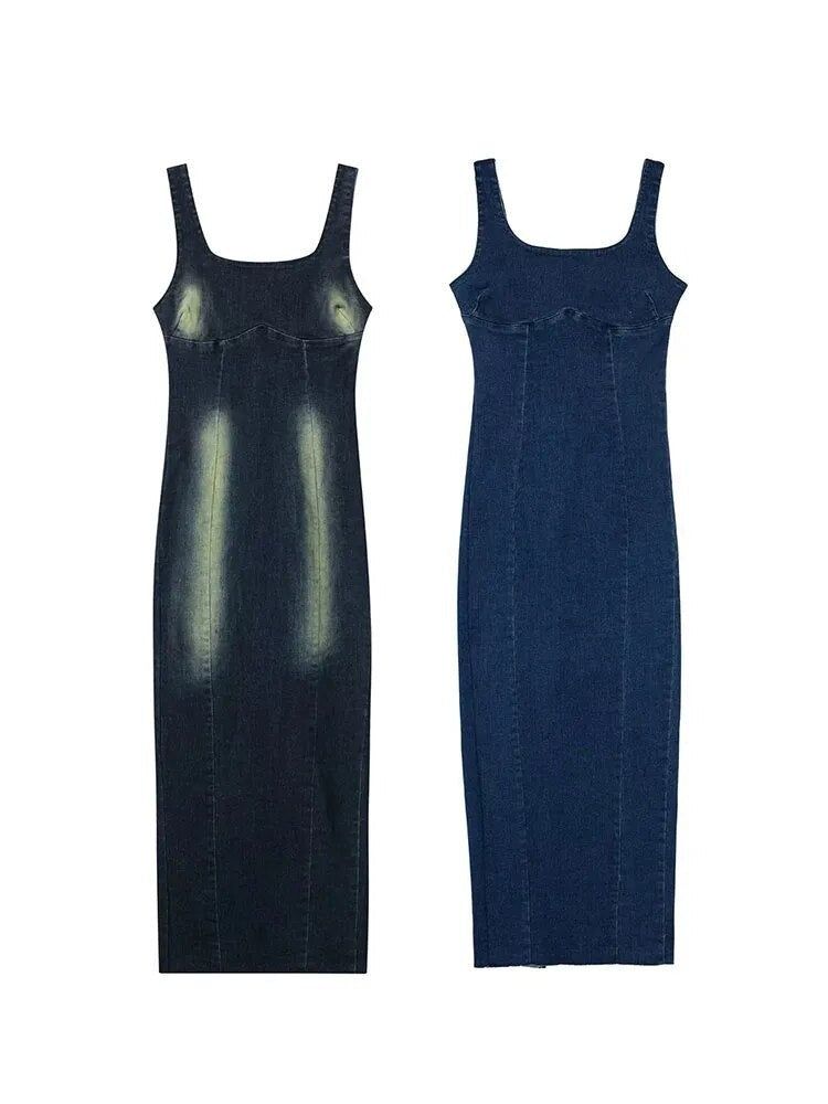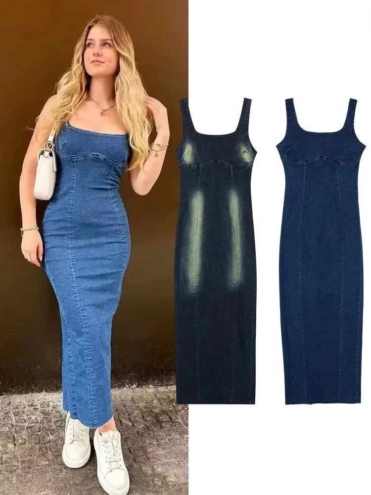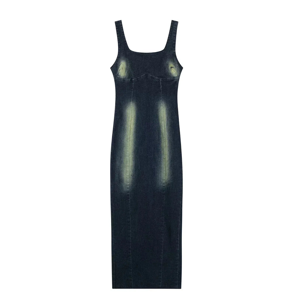 Summer Women's Retro Denim Dress Fashion Square Collar Sleeveless Open Back Zipper Slim Female Slit Mid-length Dress