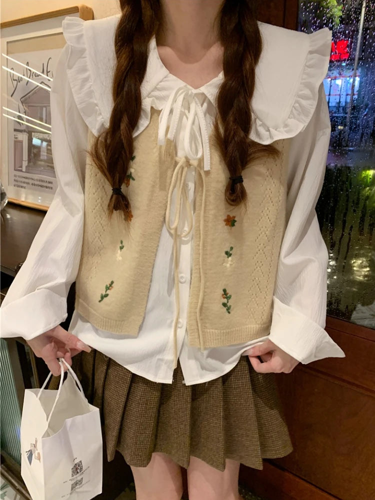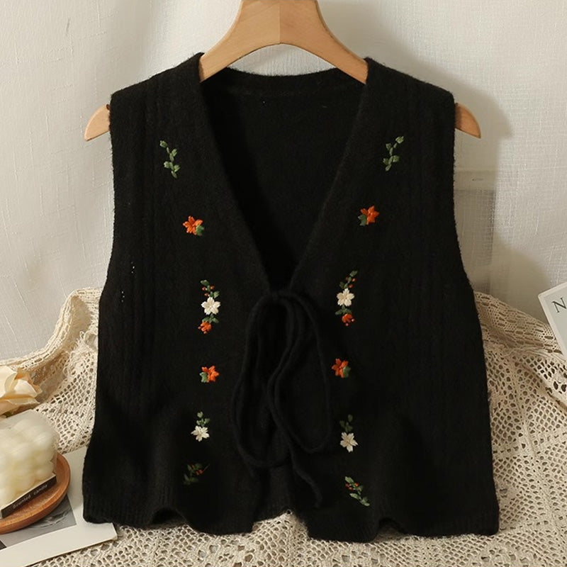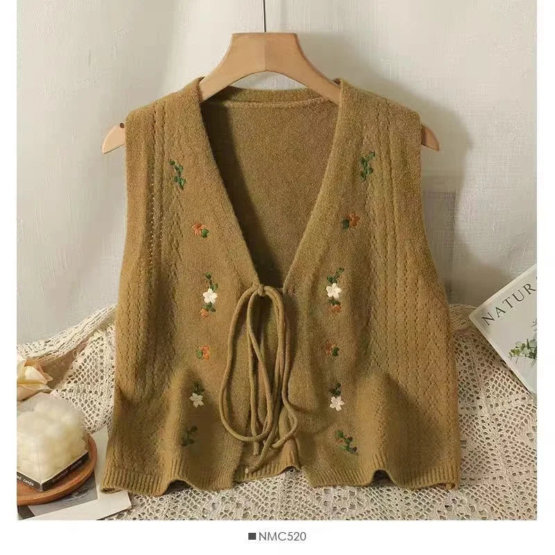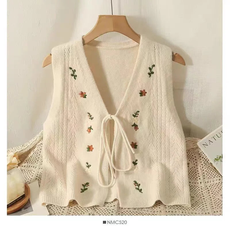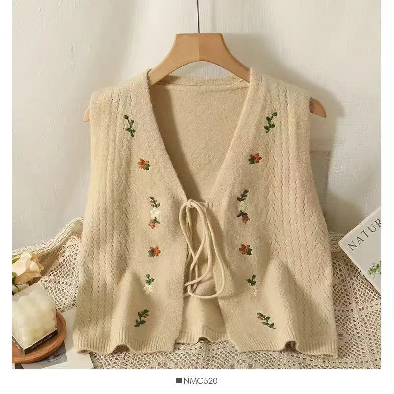 Embroidery Floral Tie Front Sweater Vest for Women Bow Tie Front Sleeveless Knit Cardigan Jacket Teen-girl Fairycore Cute Outfit