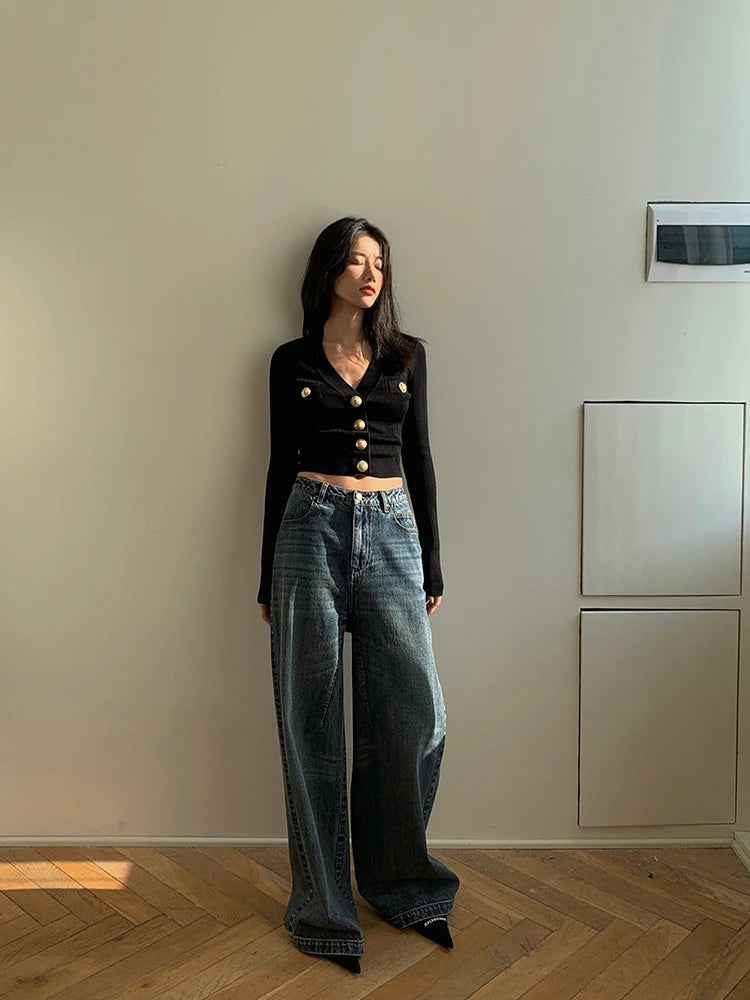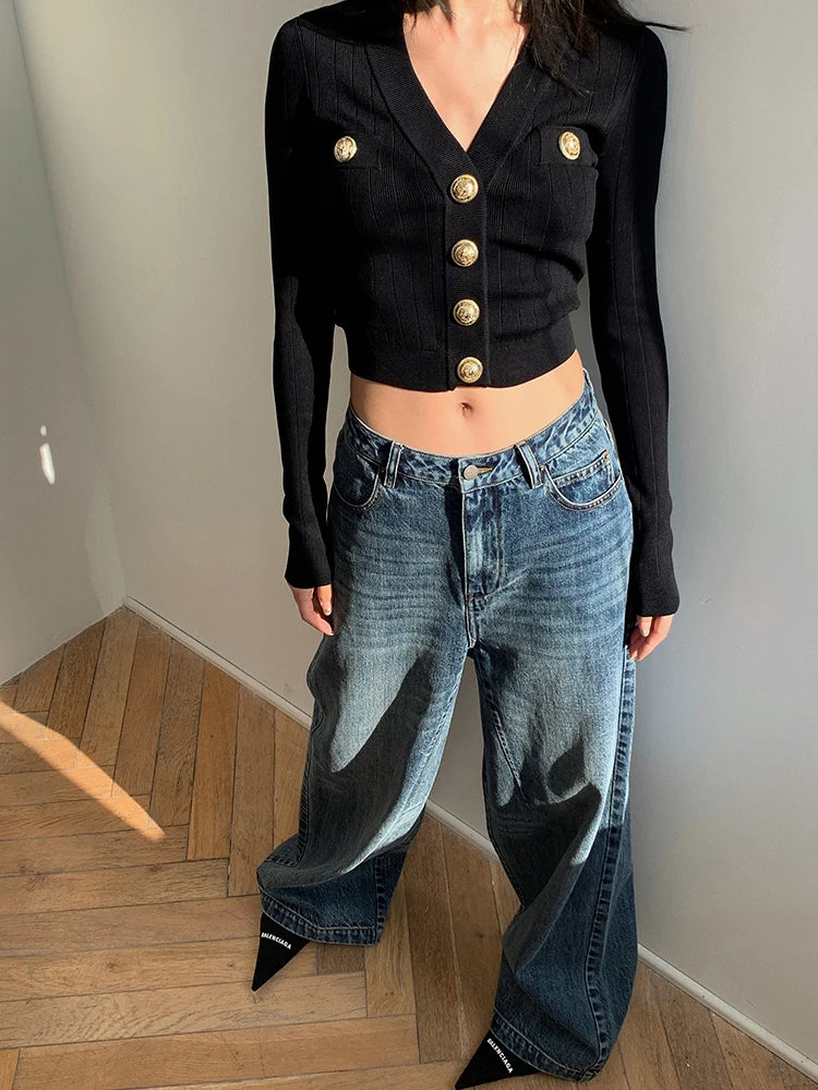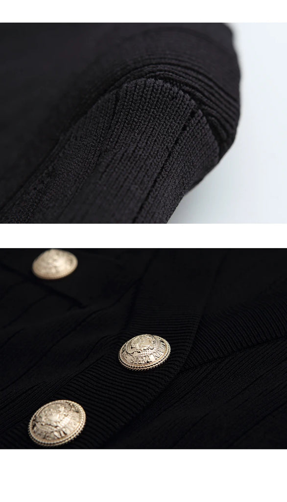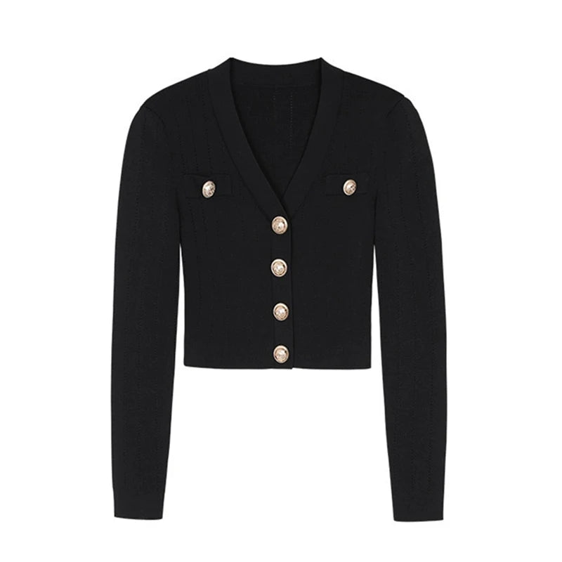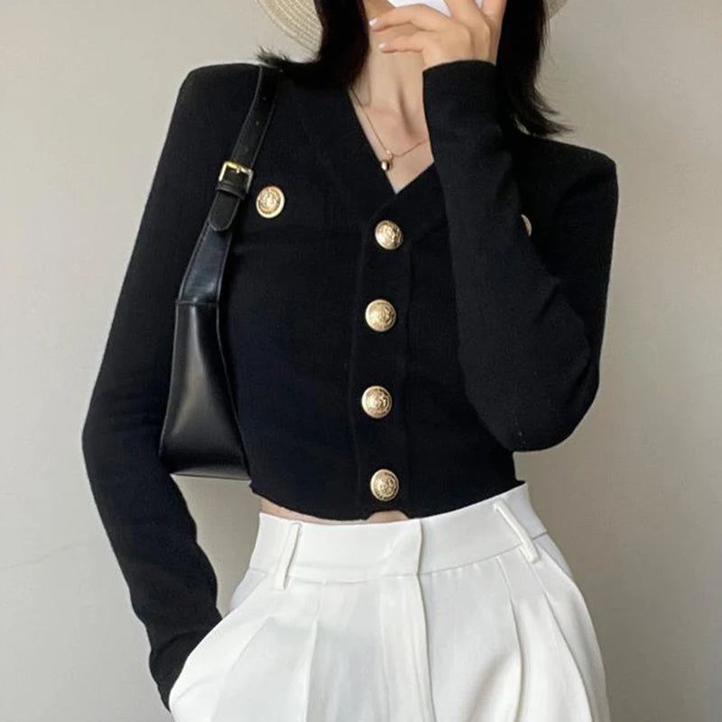 Gold Button Front Knit Cardigan Women Long Sleeve Crop Sweater Jacket Fitted Top Teen-girl Fall Winter Vintage 90s Outfit