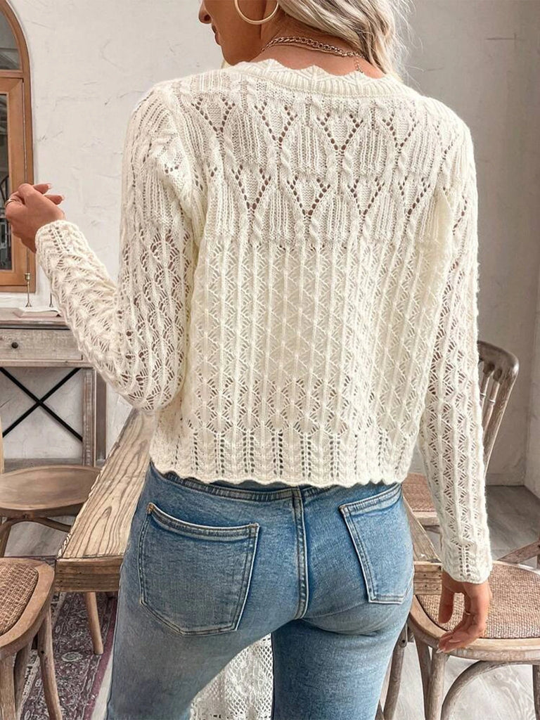 Spring and Autumn Women's Elegant Solid Color Round Neck Hollow Button Front Cardigan Sweater