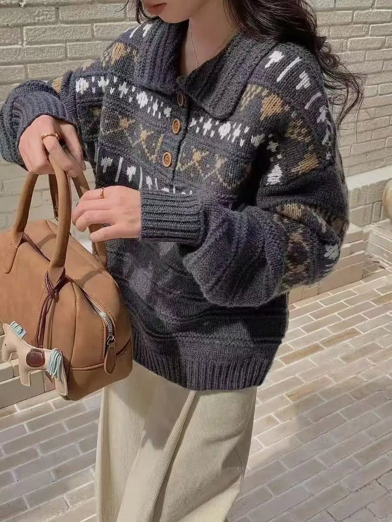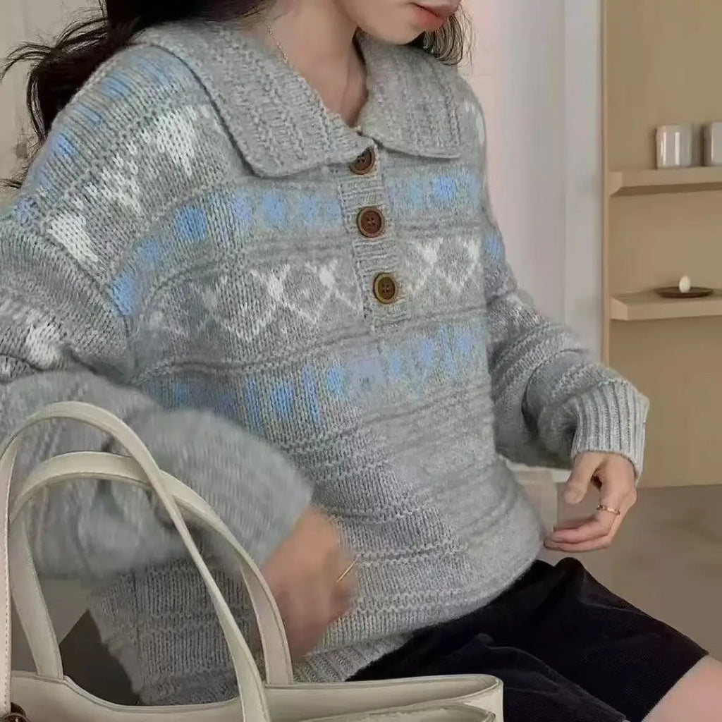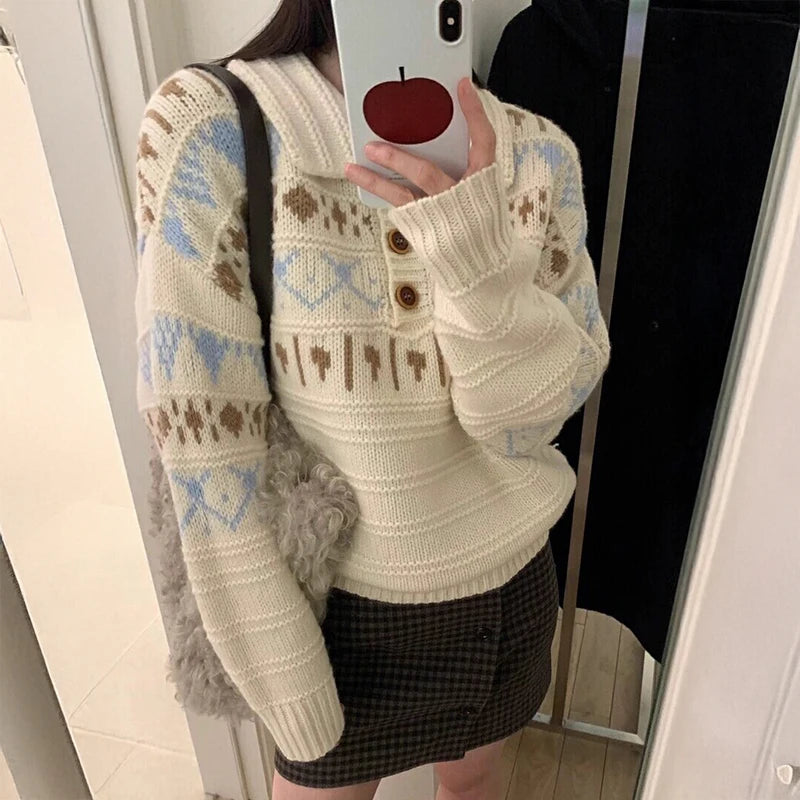 Woman Fair Isle Sweater Polo Collar Button Front Cozy Knit Pullvers Jumper Female Autumn Winter Preppy Vintage Outfit