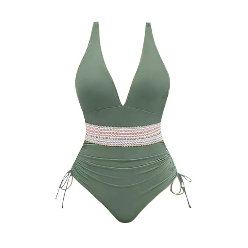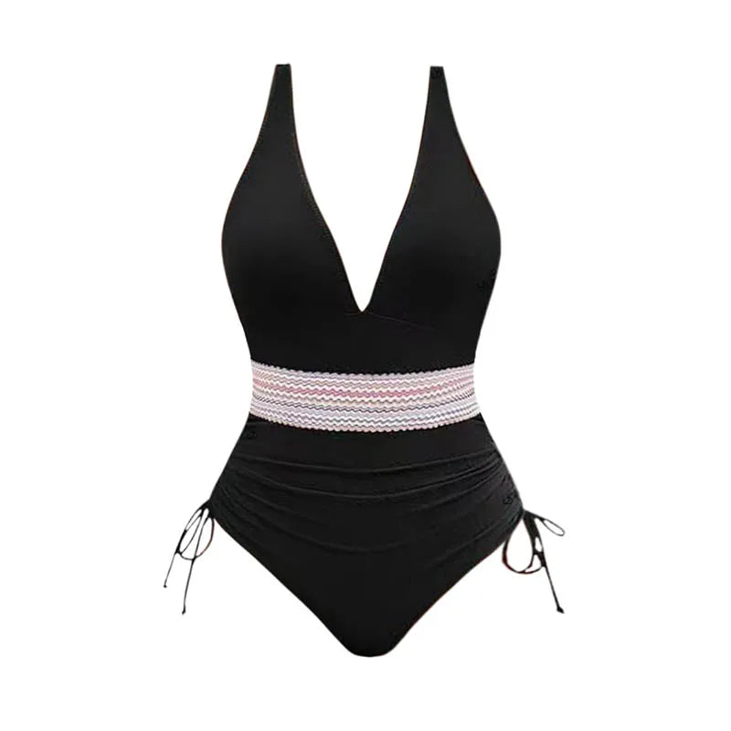 2025 Women's Swimsuit Zigzag Print Contrast Color Plunging Neck Cinched One-piece Swimsuit Beach Swimwear