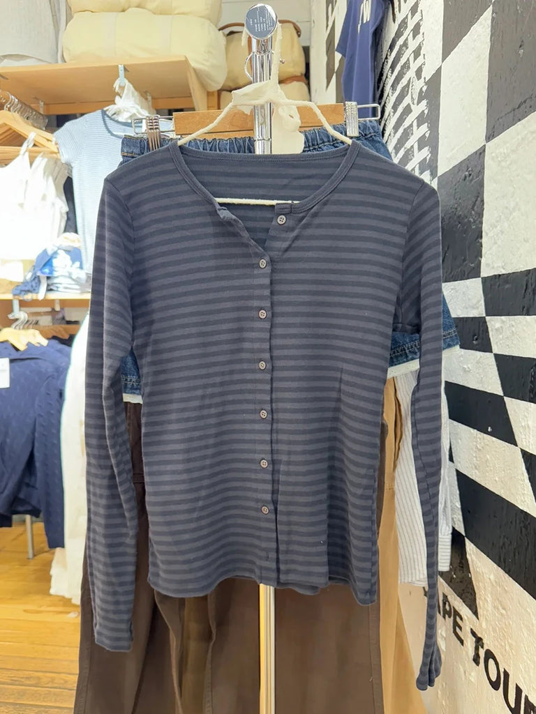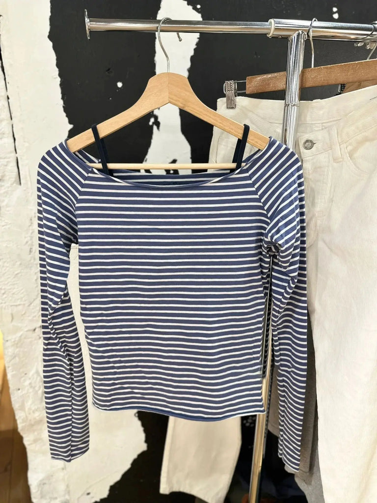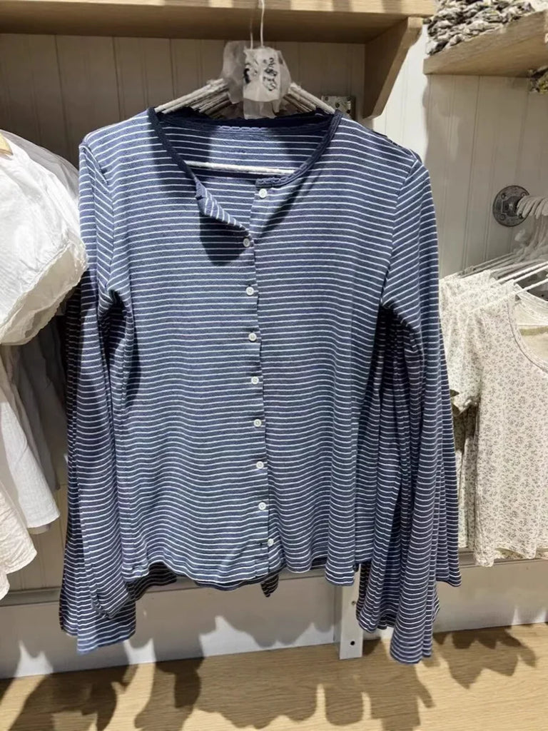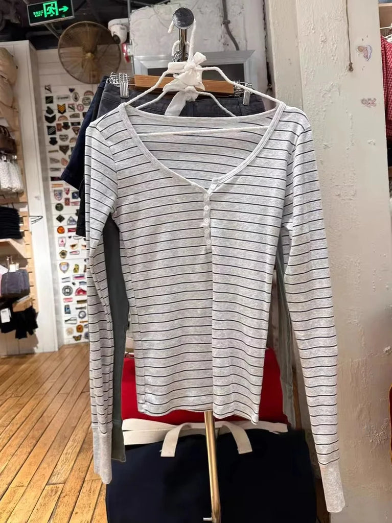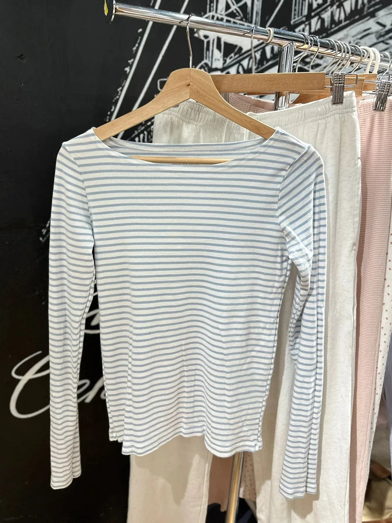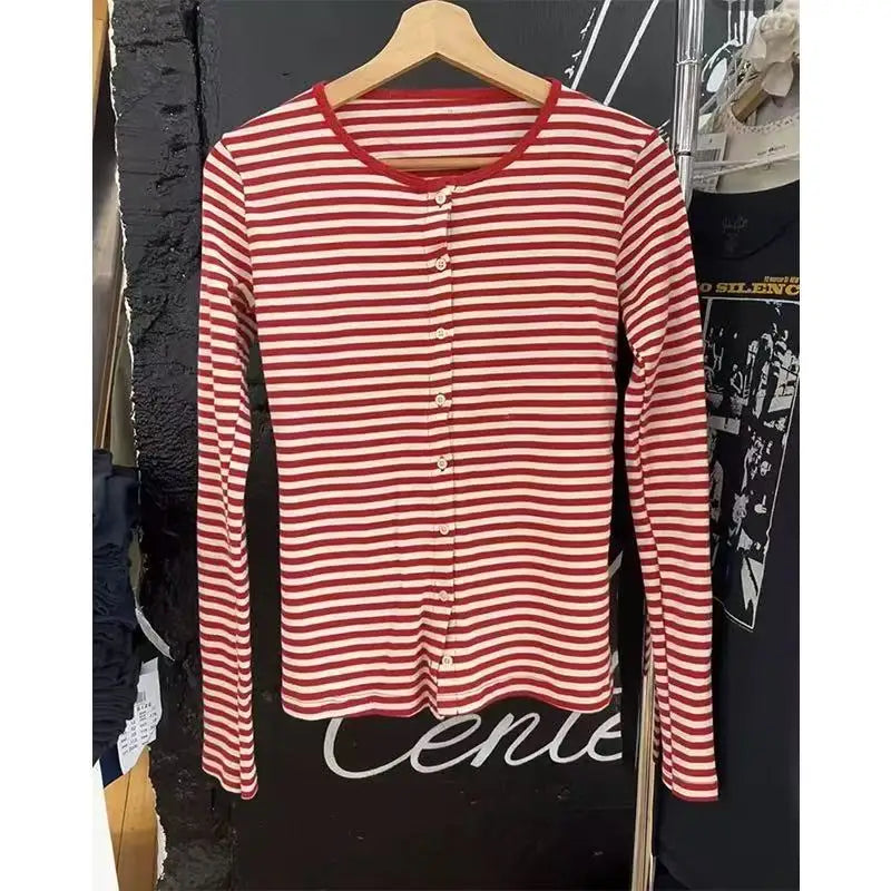 Vintage Brown Striped Slim T-shirts Women 2024 Summer Y2k Streetwear Round Neck Long Sleeve T Shirt Harajuku Casual Cotton Tops