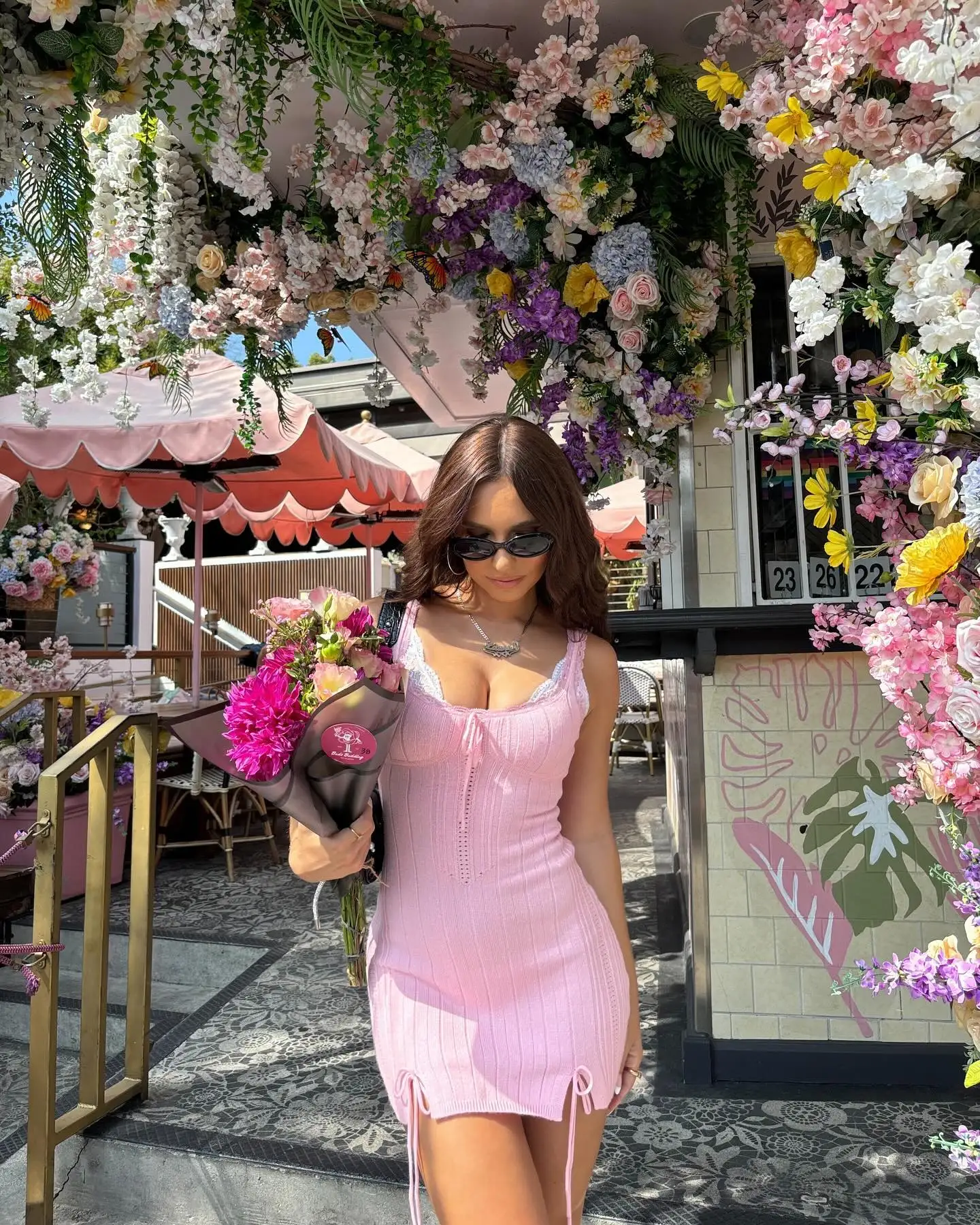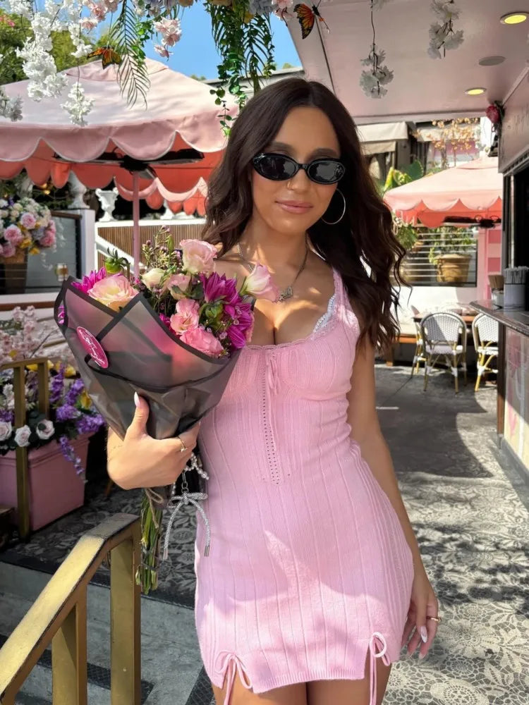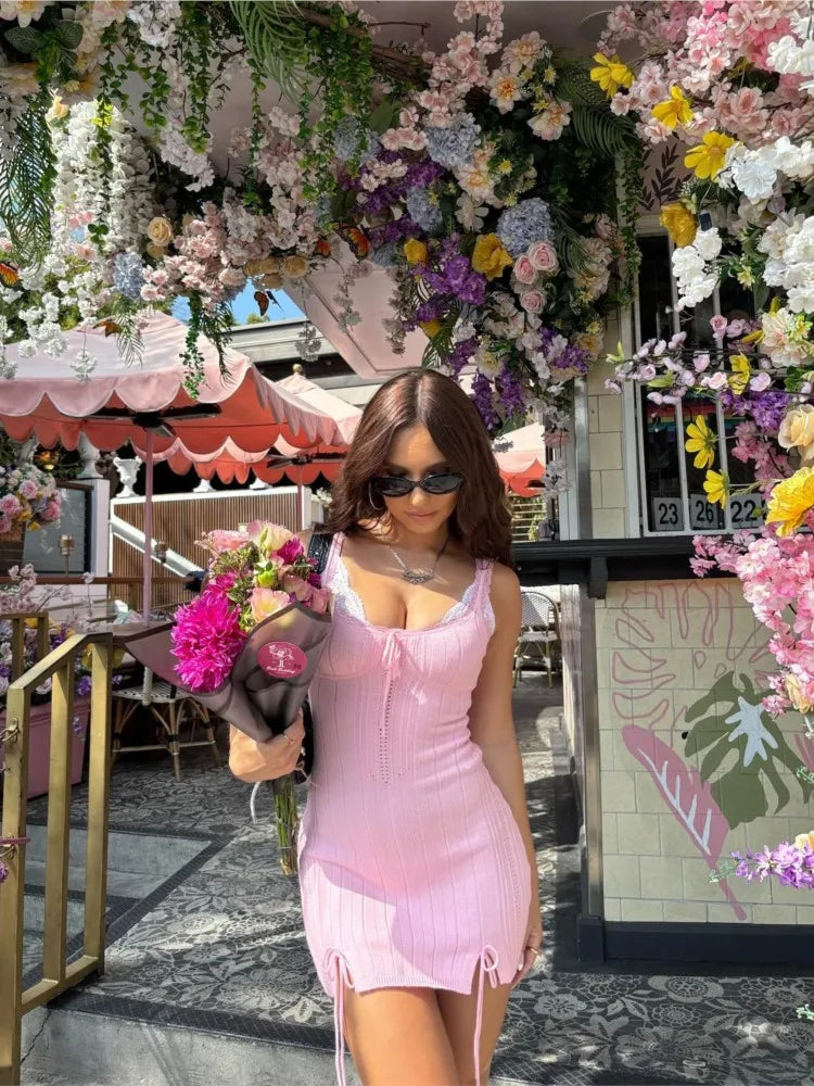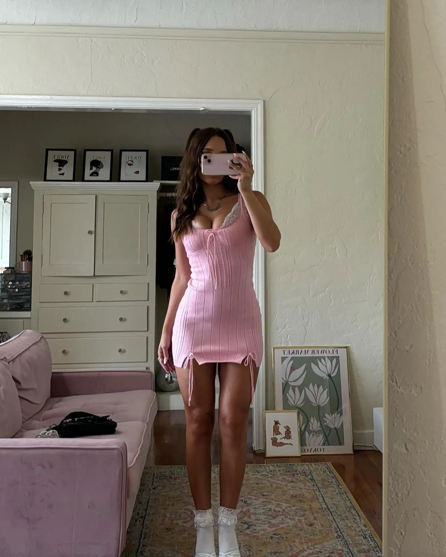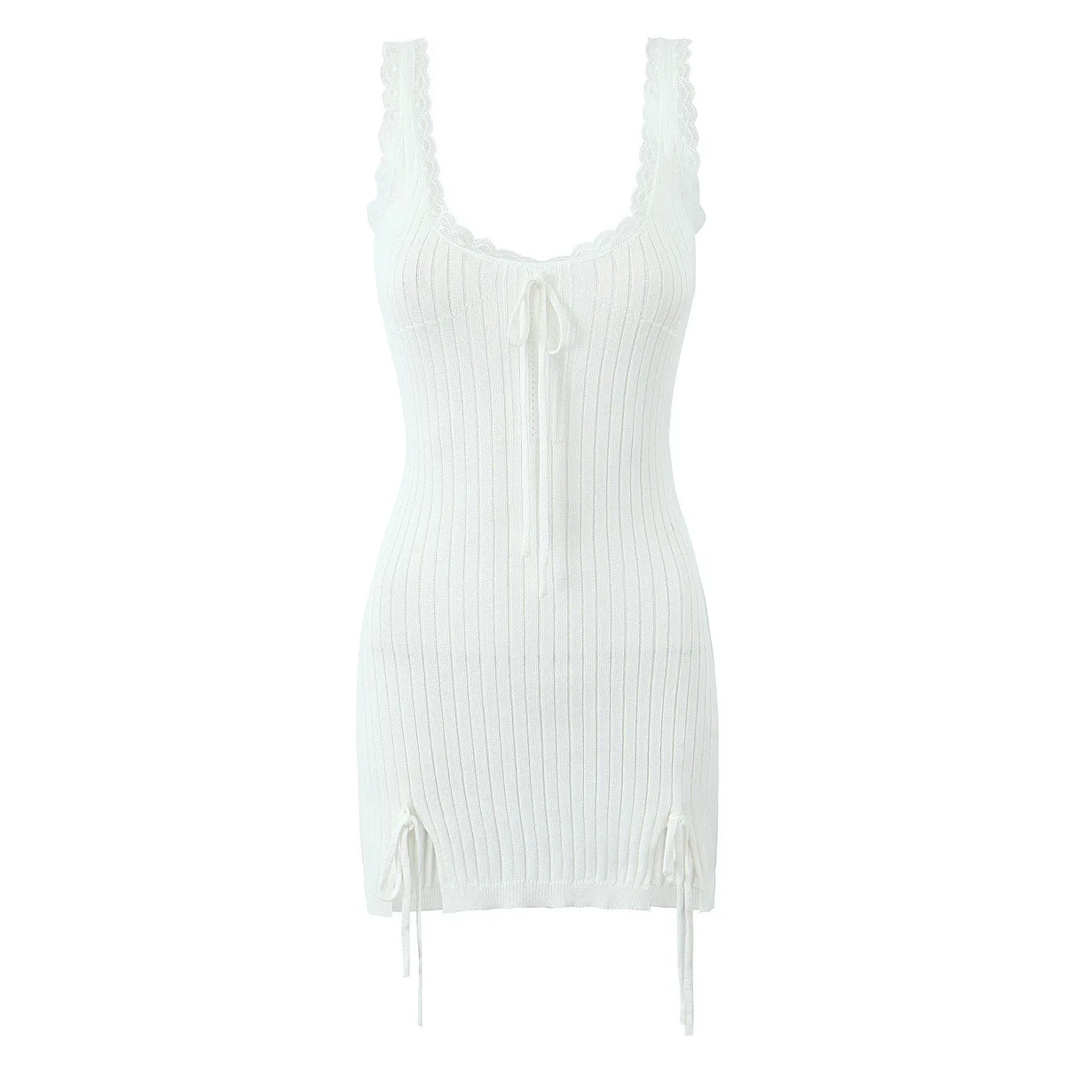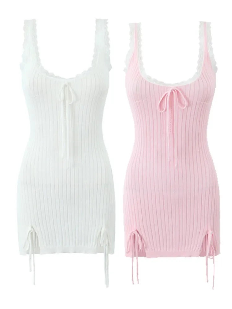 2025 New Pink White Lace Patchwork Short Dress For Women's Clothing Ruffle Square Collar Vacation Beach Summer Knit Slip Dress