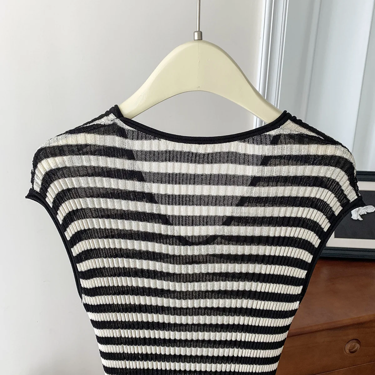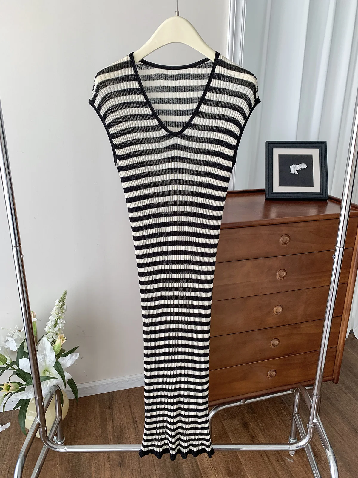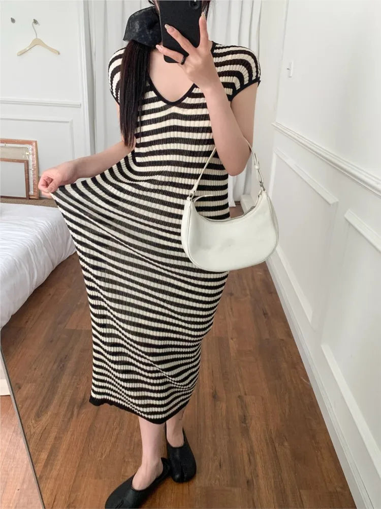 2025 Short Sleeve Stripe Knit Long Dress V-neck Thin Hollow Out Casual Dress High Stretchy Summer Vacation Beach Female Cloth