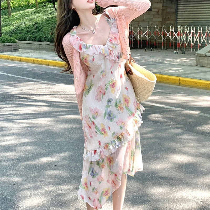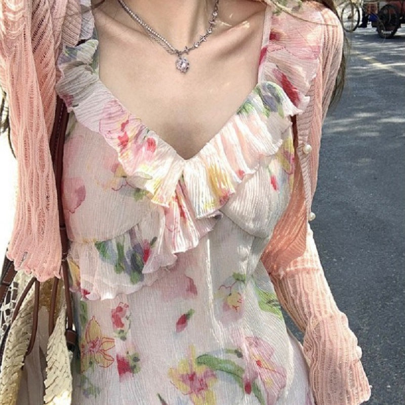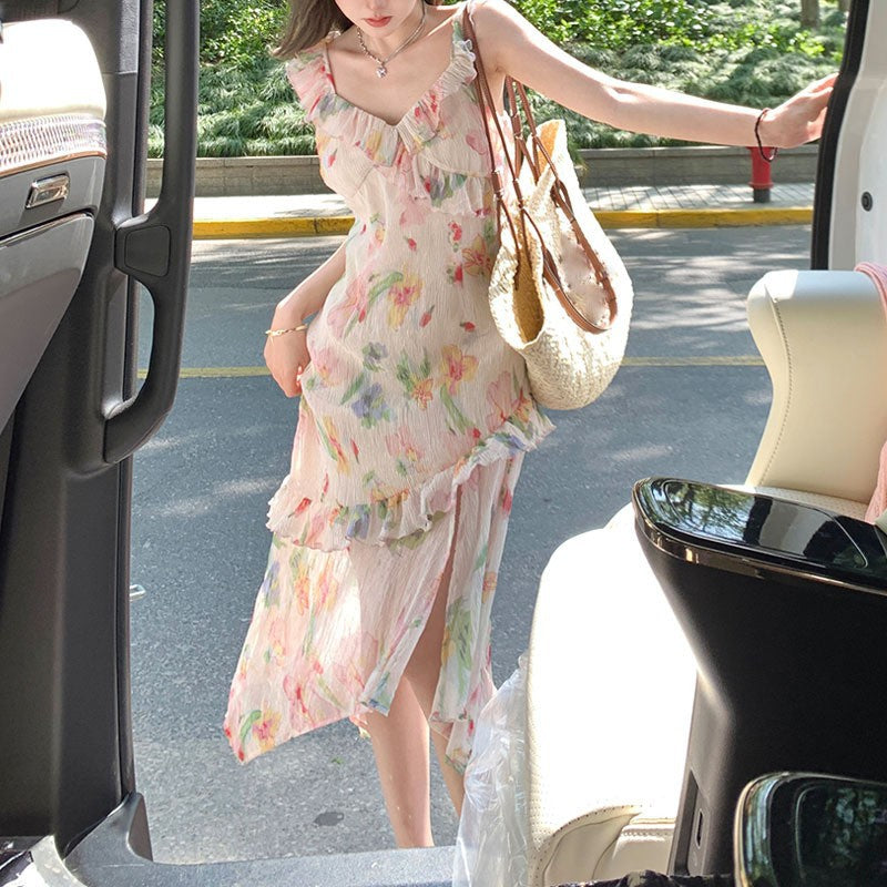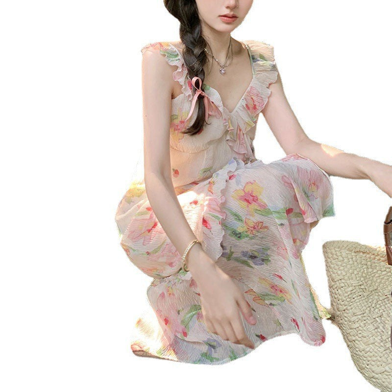 summer new style skirt celebrity printed suspender skirt female vacation high-end wood ear chiffon dress