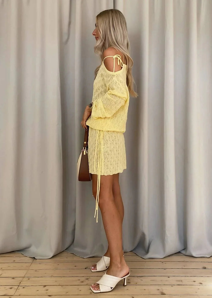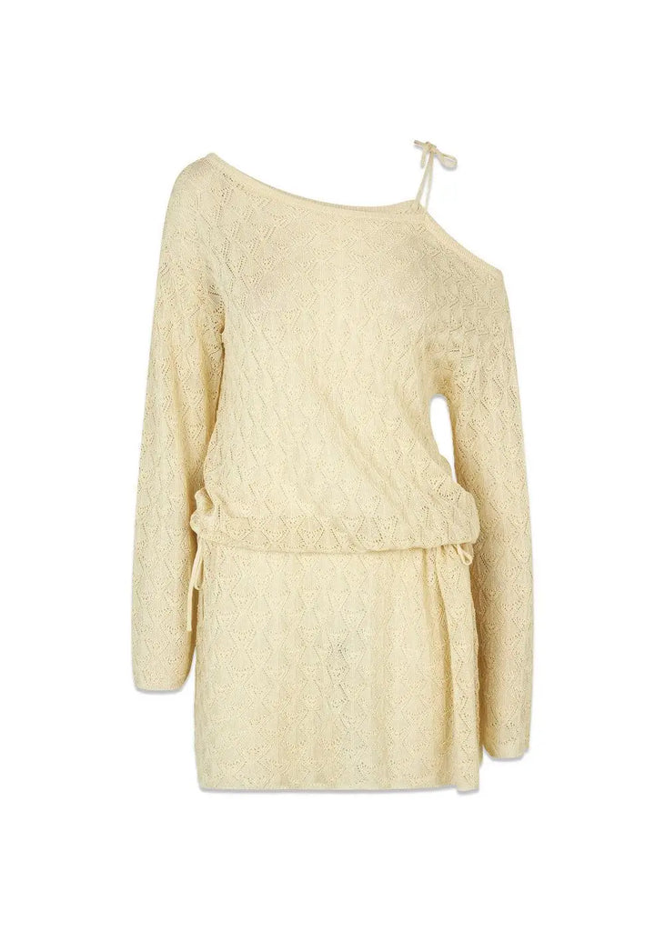 Butter Yellow Sexy One Shoulder Long Sleeve Drawstring Waist Knit Dresses For Women 2025 Autumn Beach Vacation Mini Dresses C105