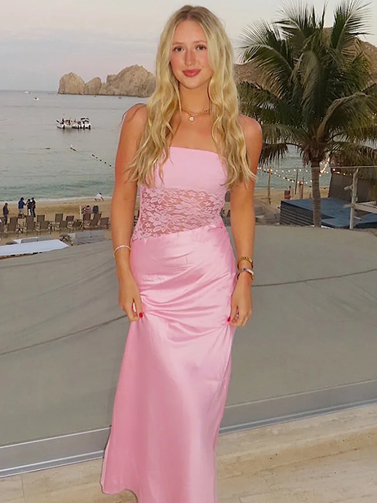 Lace Splice Strapless Dress For Women Hollow Sexy Sleeveless Backless Dress Pleated Elegant Slim Beach Vacation Dress