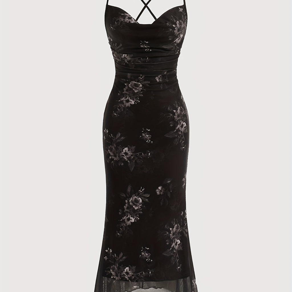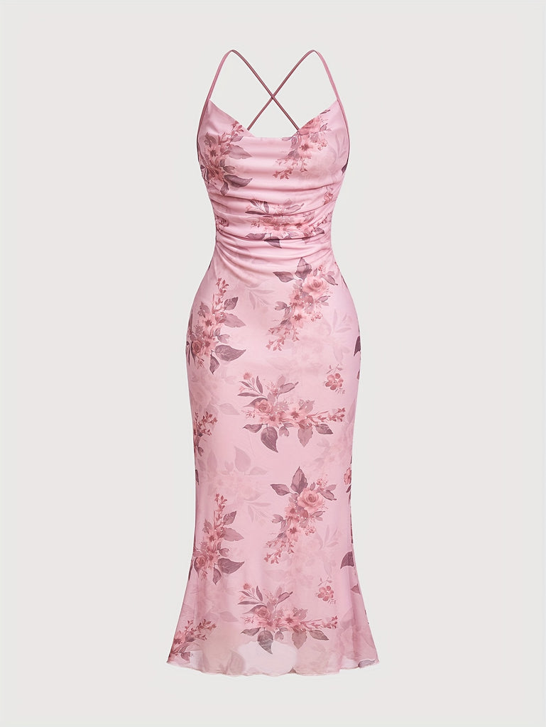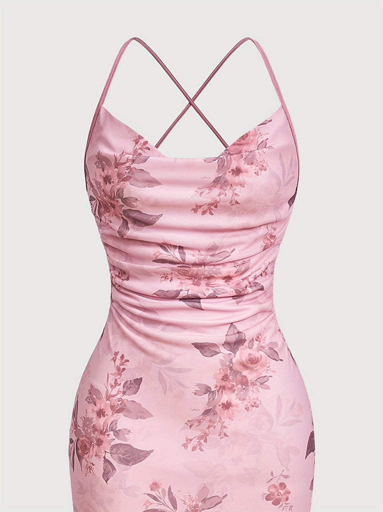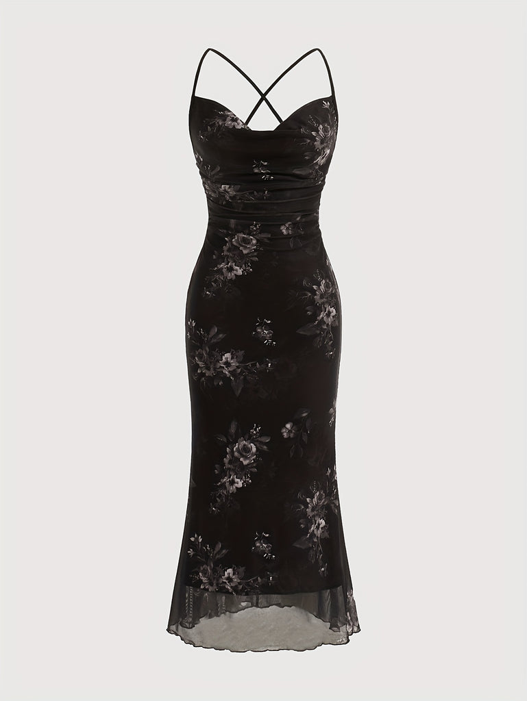 [Plus Size Floral Print Vacation Dress] Chic Plus Size Floral Print Dress with Cowl Neck & Cross-Back Design - Stretchy Polyester Blend, Perfect for Vacation