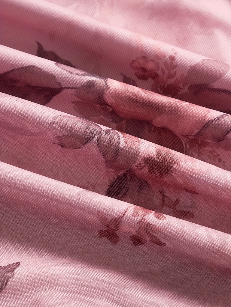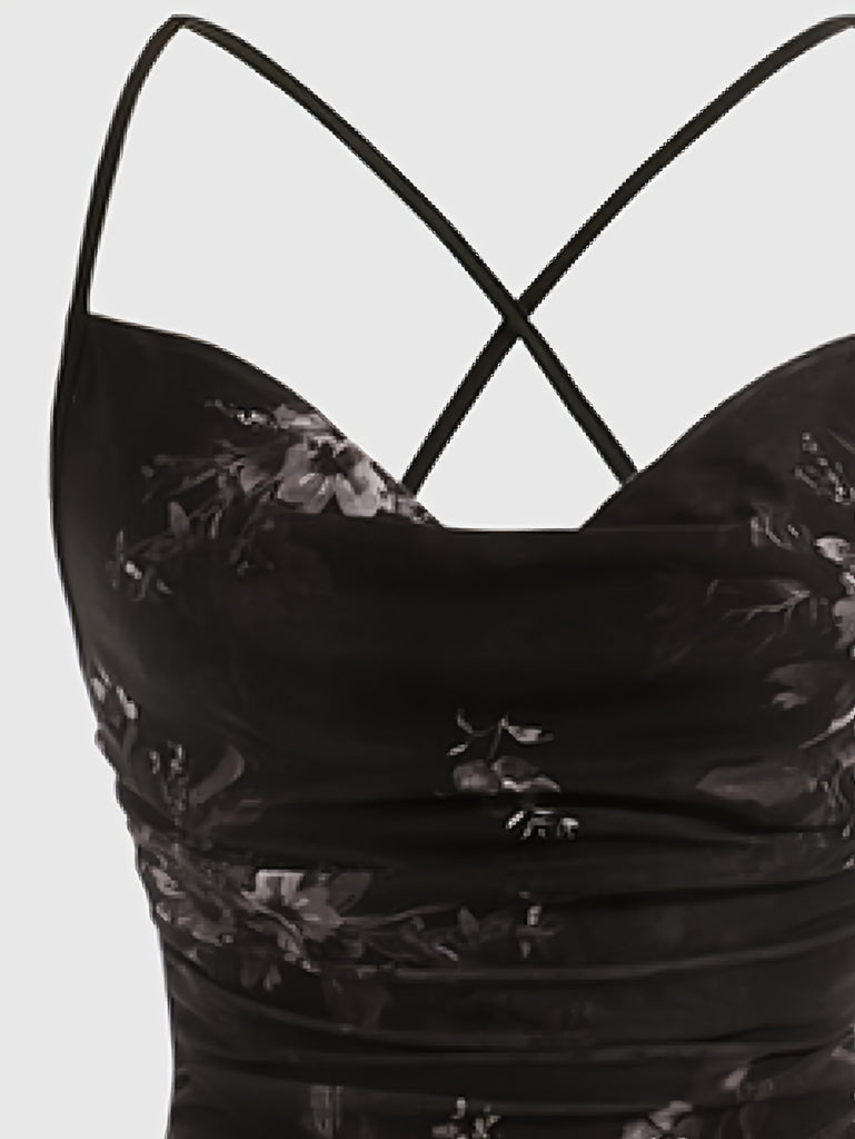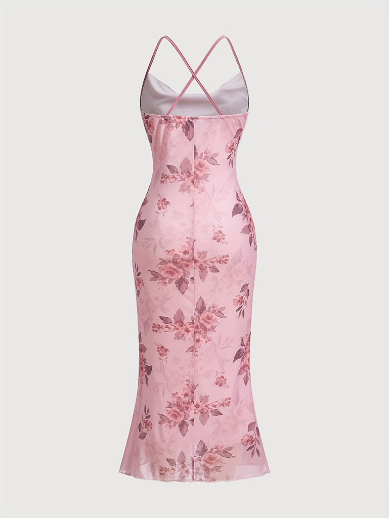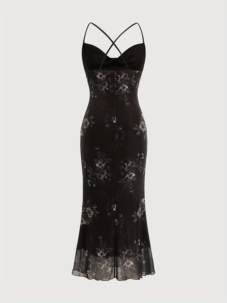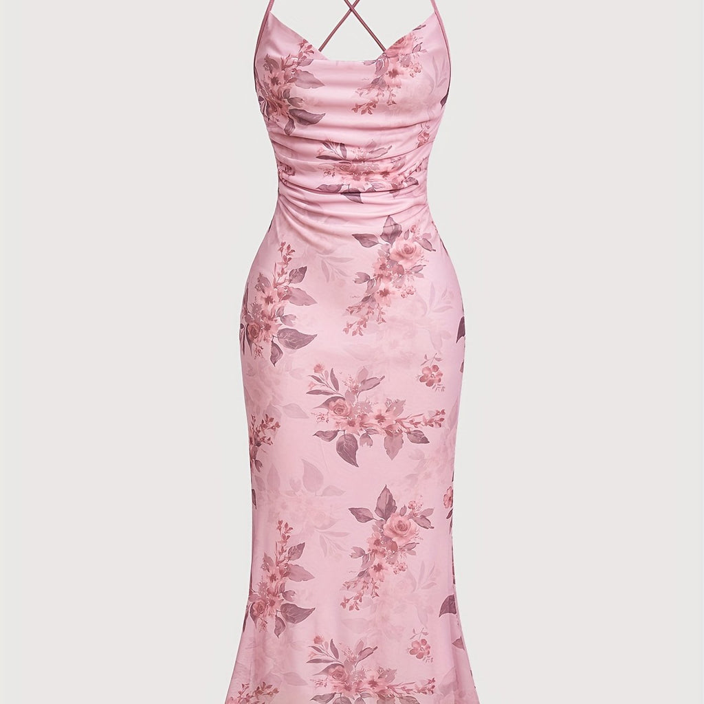 [Plus Size Floral Print Vacation Dress] Chic Plus Size Floral Print Dress with Cowl Neck & Cross-Back Design - Stretchy Polyester Blend, Perfect for Vacation