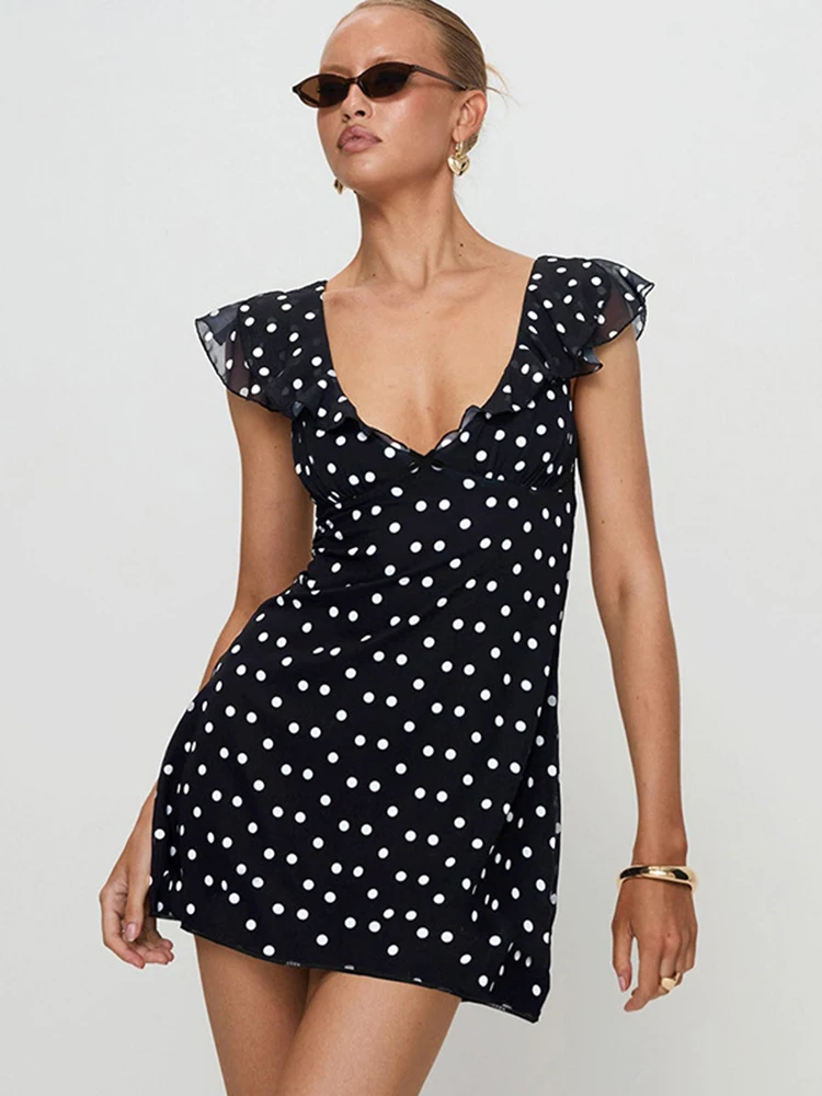Sexy Polka Dot Contrast Dress Women's Deep V neck Sleeveless High Waist Mini Dress Slim A-line Lady Vacation Party Dress