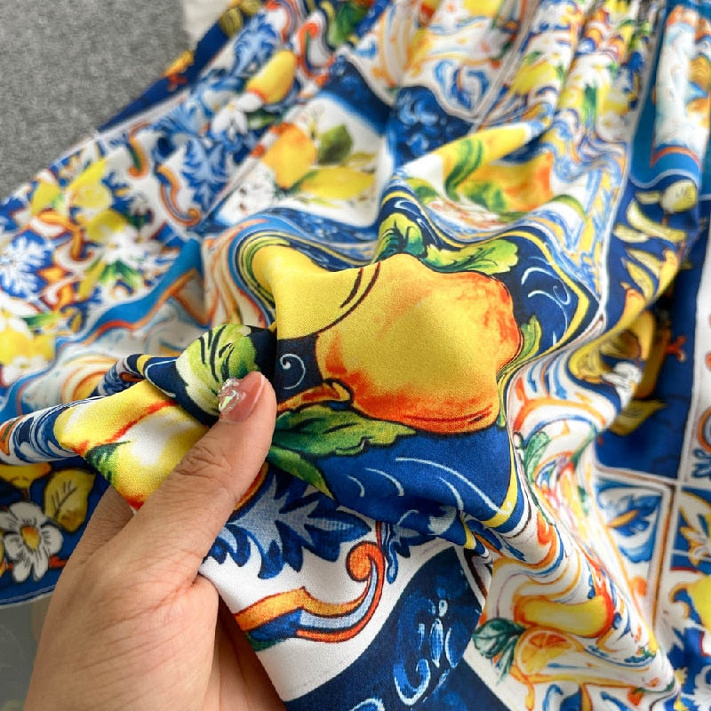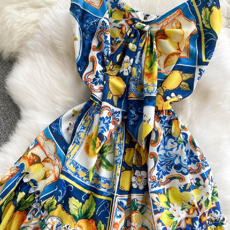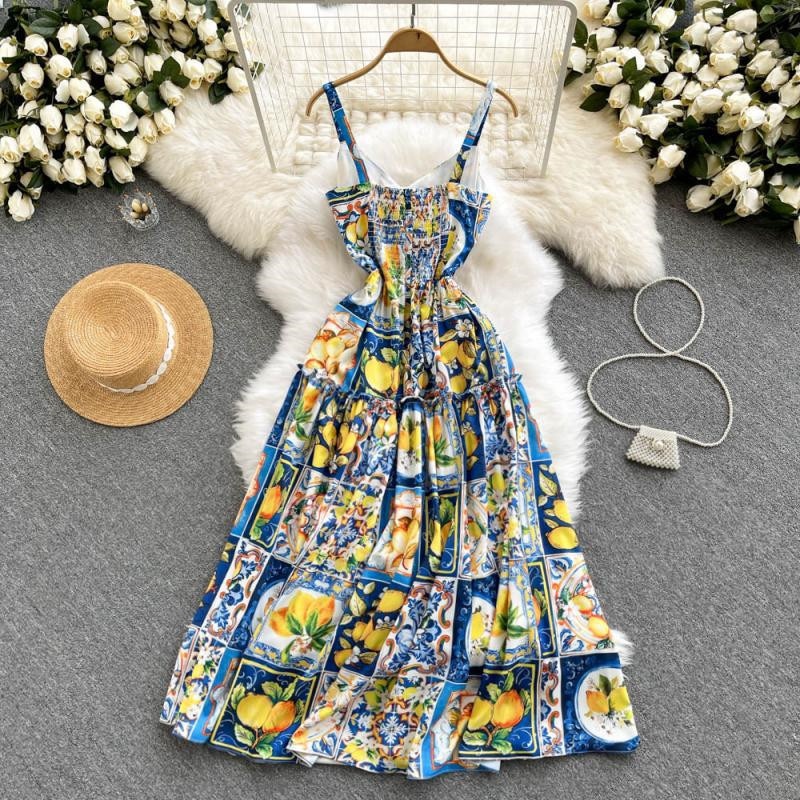 Summer dress women Fashion Runway Long Dresses Vacation Elegant sexy Strap Lemon print runway women dress