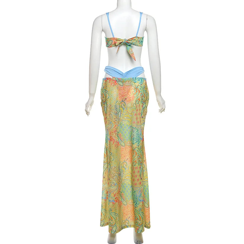 Summer Sexy Print 3 Pics Dress Set Women Pleated Bra + Low Waist Print Long Skirt Suit Female Summer Vacation Beachwear Suits