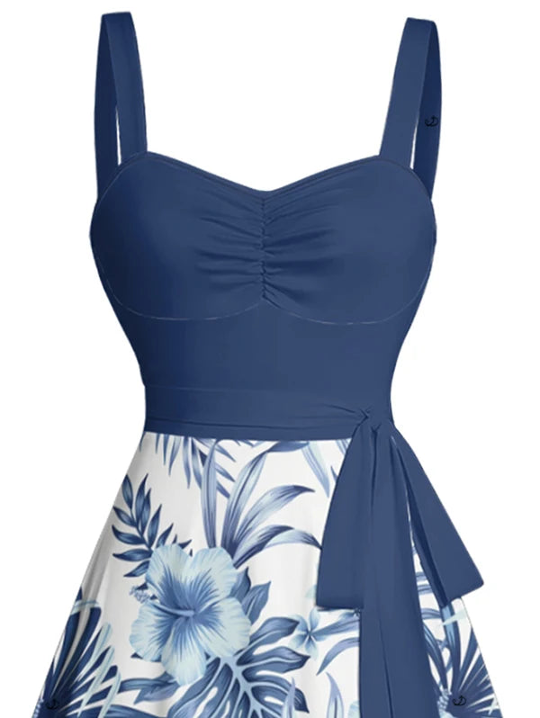 Women's Summer Dresses 2025 Vacation Tropical Flower Leaf Print Belted Mini Dress Sleeveless Beach Dress