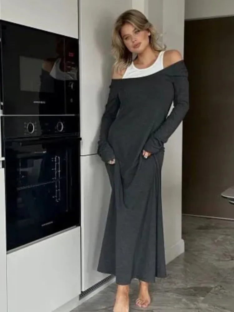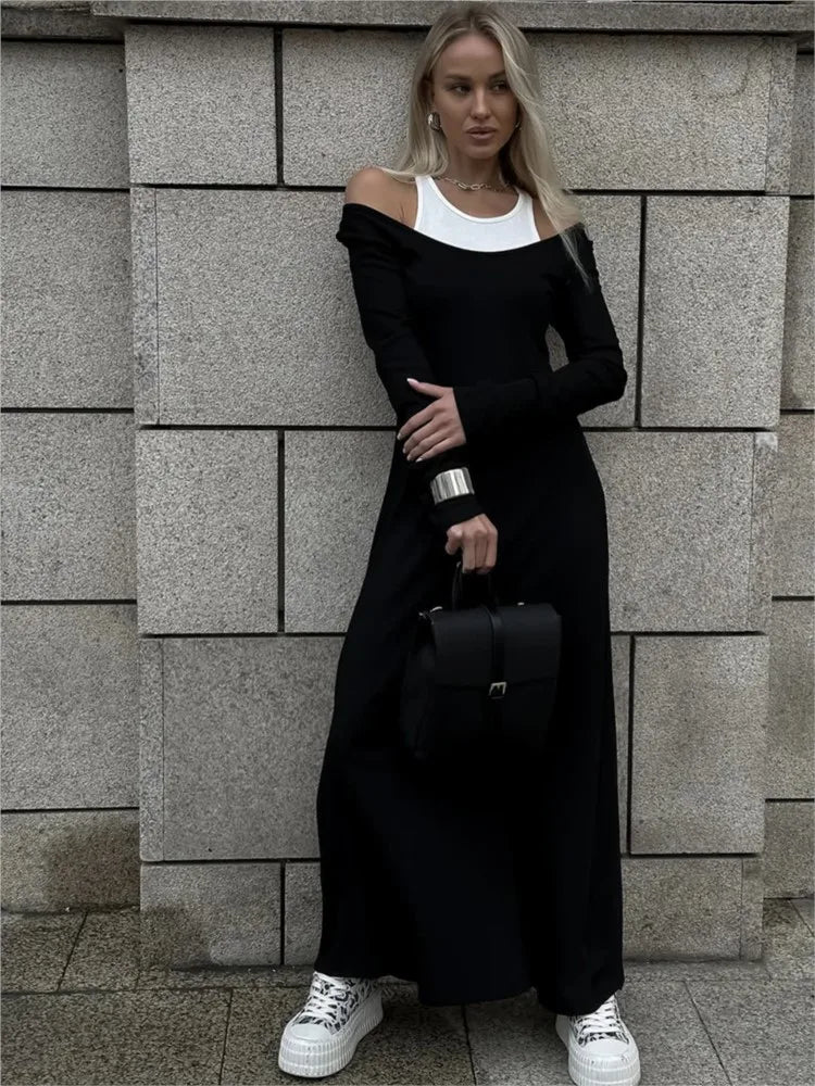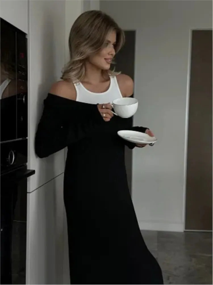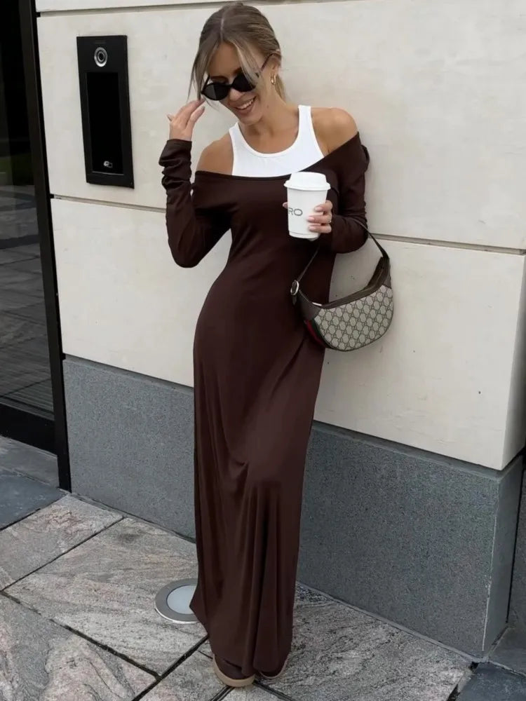 Fashion Fake Two Piece Shoulder Off Long Dress Modal Soft Vintage Slash Neck Slim Women Dress 2025 New Winter Fall Female Cloth