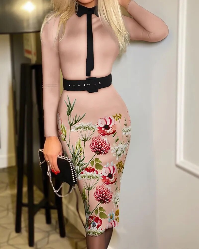 Office Lady Vintage Print Long Sleeve Belt Slim Bodycon Dress Women Summer New Elegant Fashion Commute Dresses Vestidos Feminino