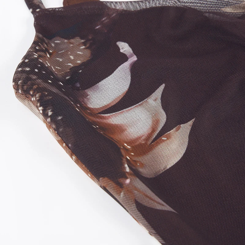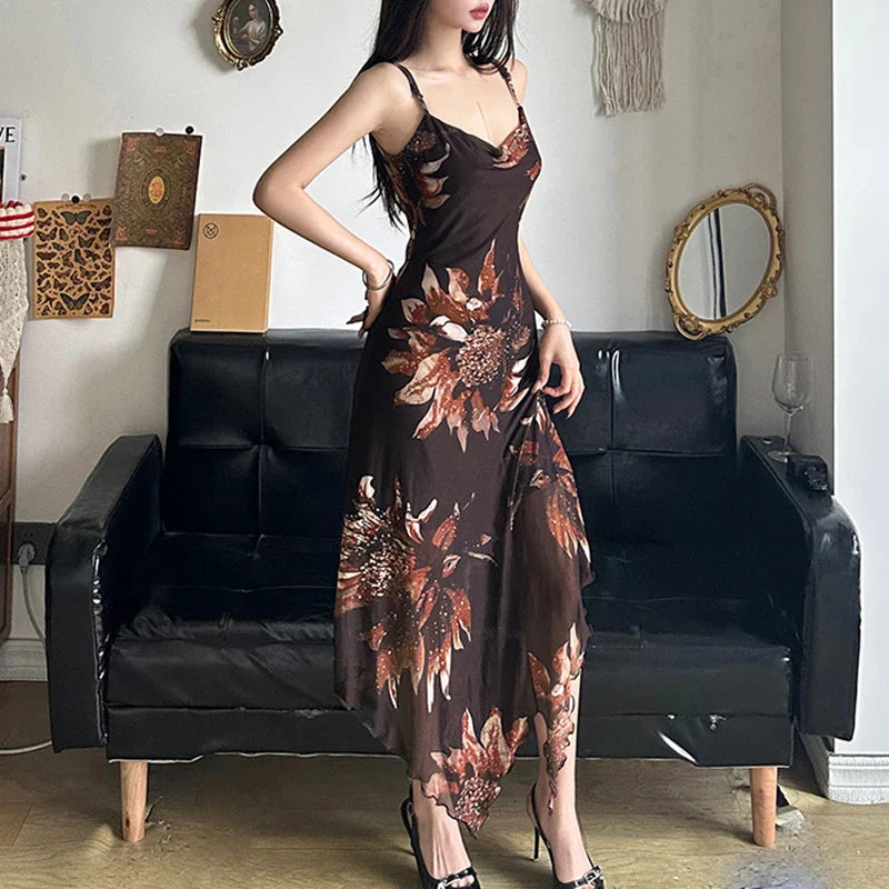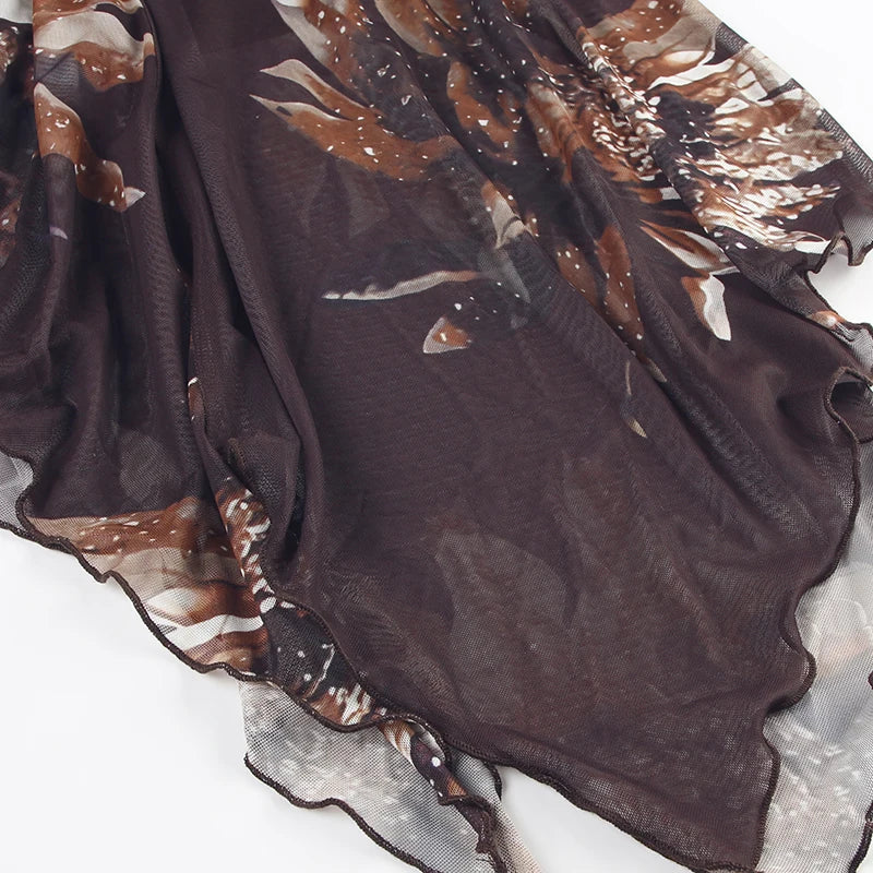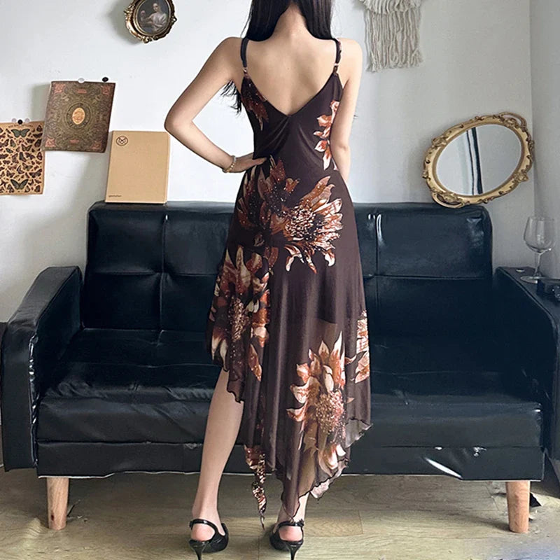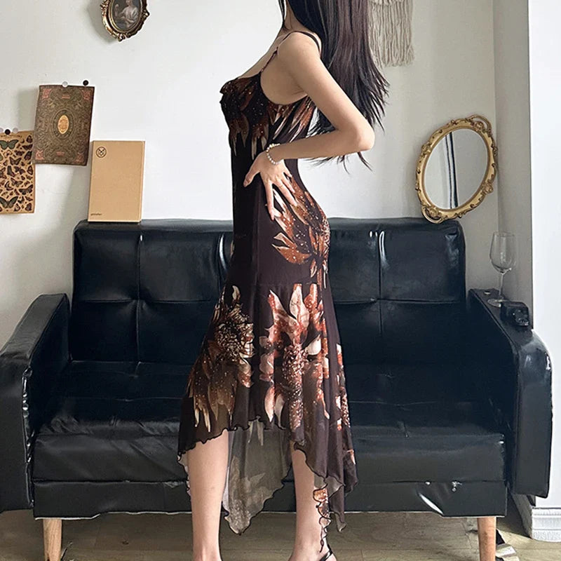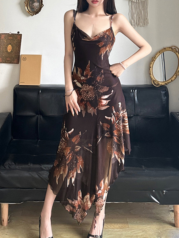 Vintage Asymmetrical Flowers Printing Mesh Dress