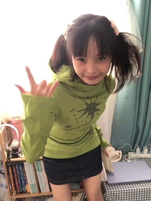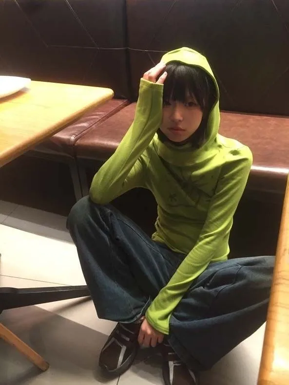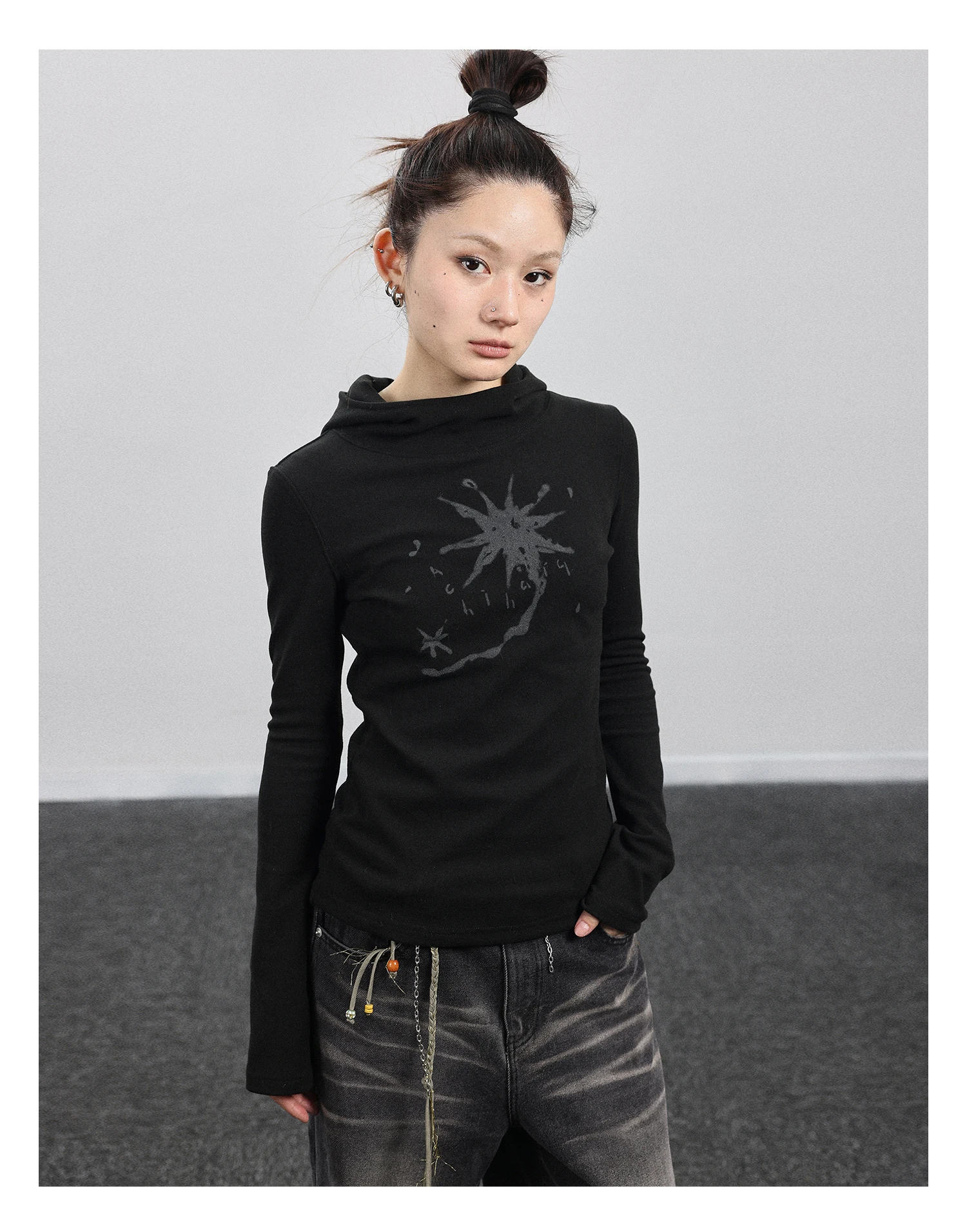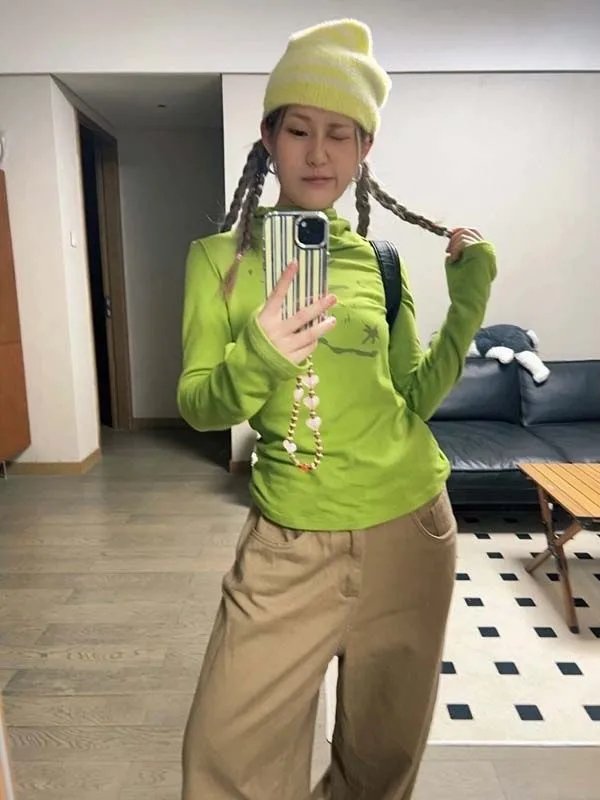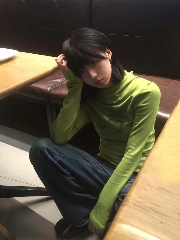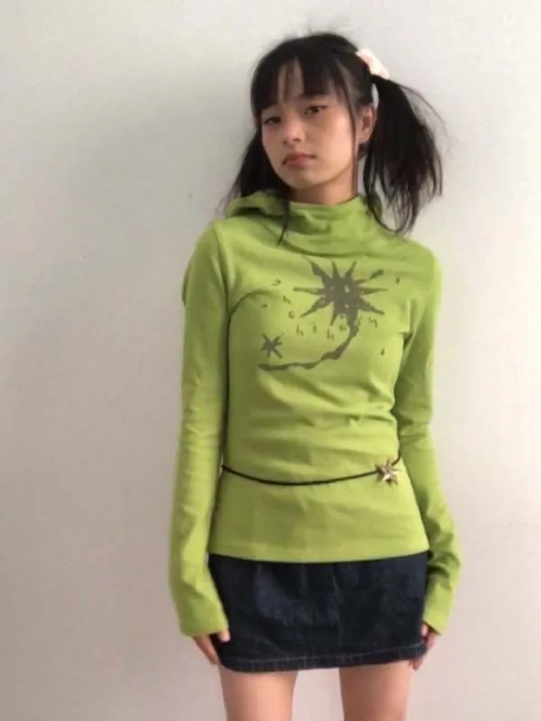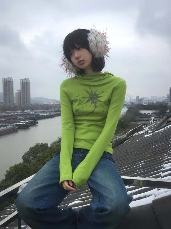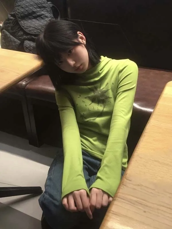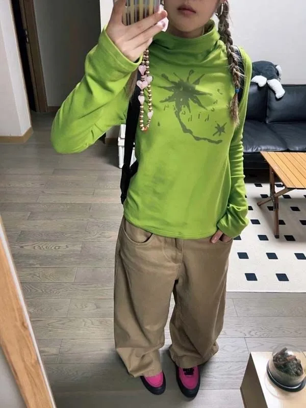 Gothic Print Graffiti T Shirt Women Turtleneck Long Sleeve Tee Tops Y2k Vintage Tops 2000s Japanese Streetwear Tshirts