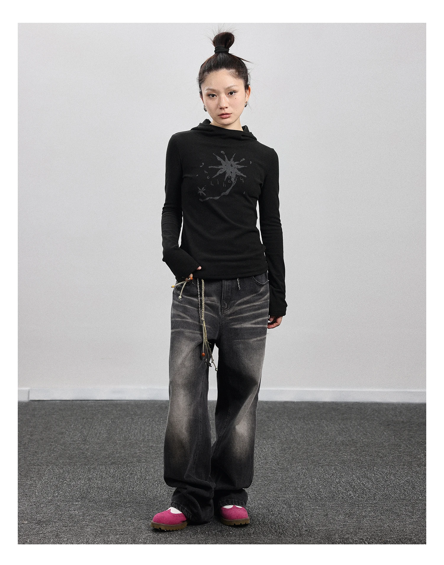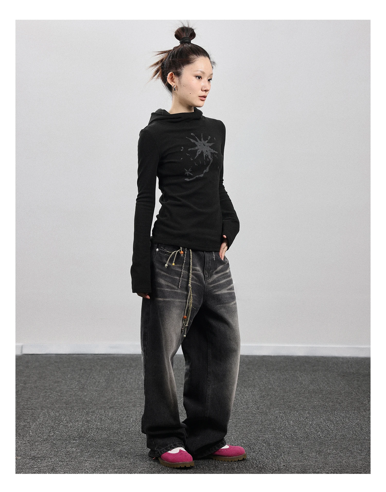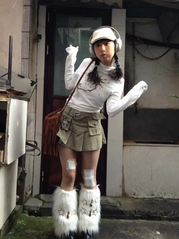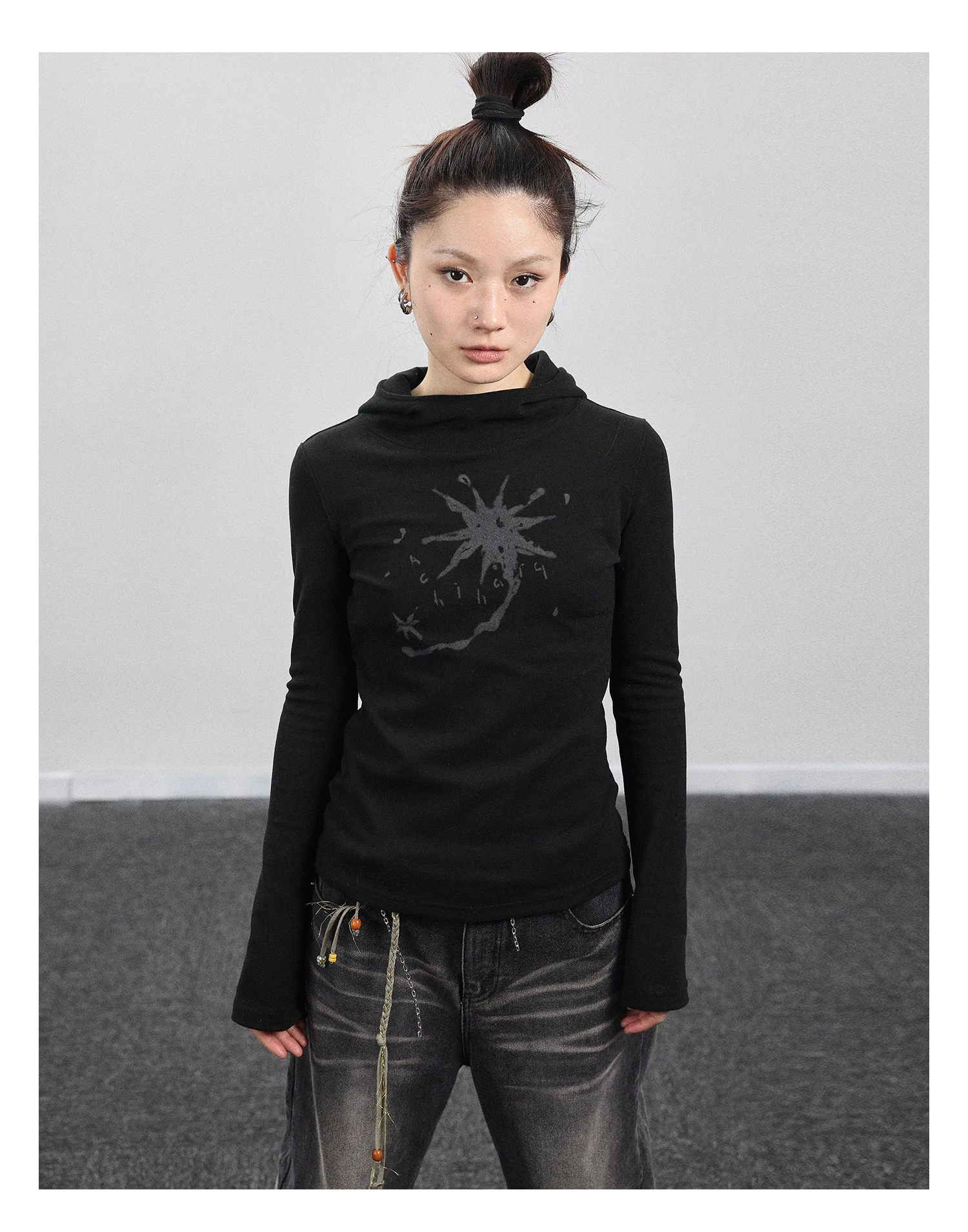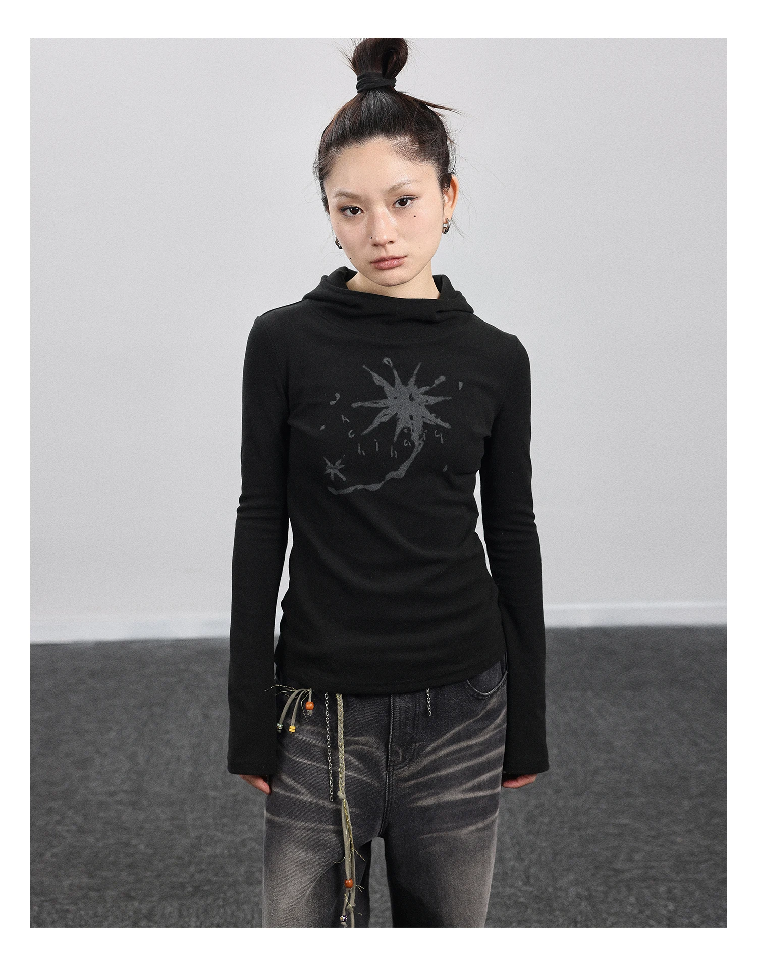 Gothic Print Graffiti T Shirt Women Turtleneck Long Sleeve Tee Tops Y2k Vintage Tops 2000s Japanese Streetwear Tshirts