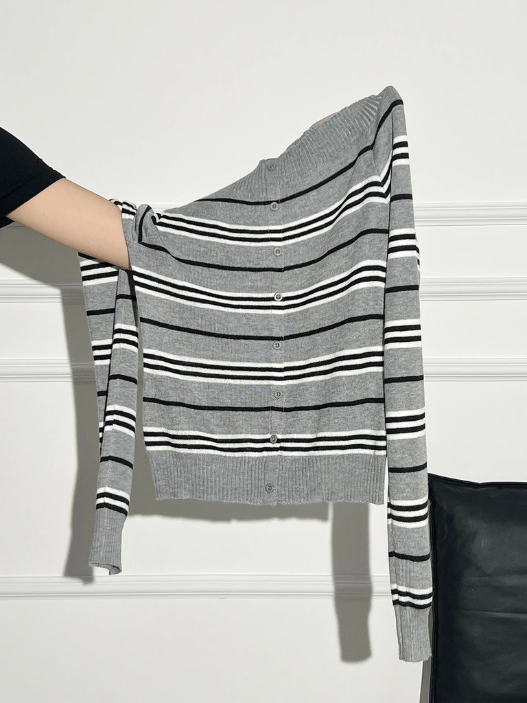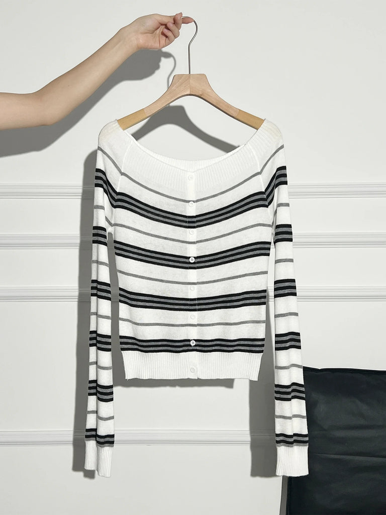 Long Sleeve Off Shoulder Stripe Knit Top for Women Button Front Off-the-Shoulder T-shirt Teen-girl Y2K Clothing