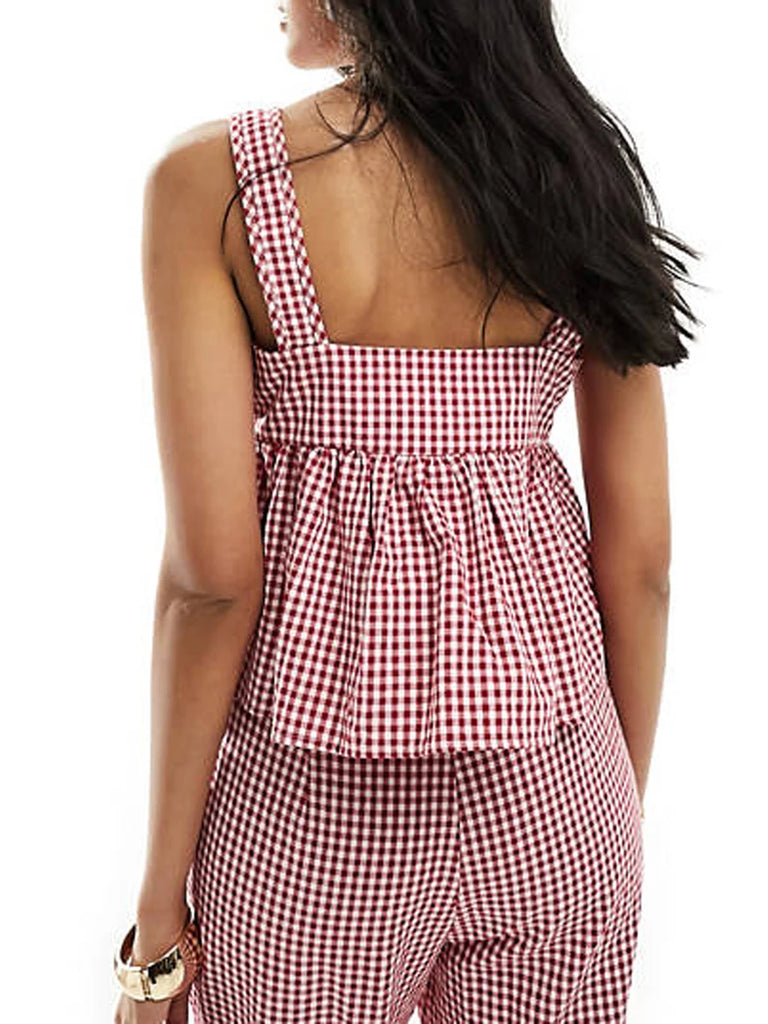 Y2k Red Gingham Tank Top Sleeveless Women Bow Tie Down Plaid Camisole Ruffle Hem Peplum Tops Summer Streetwear