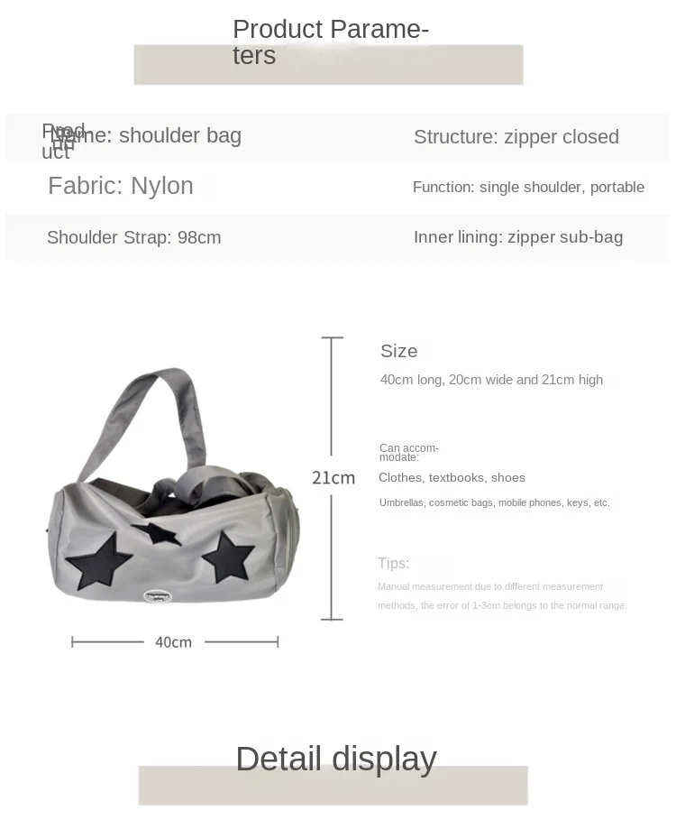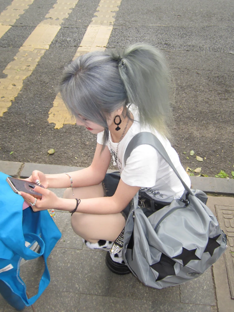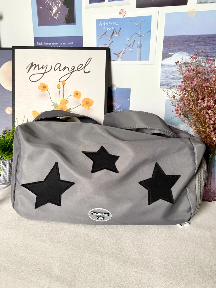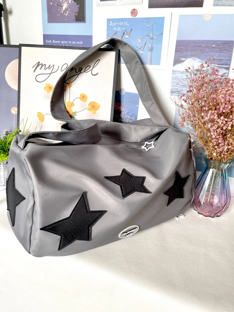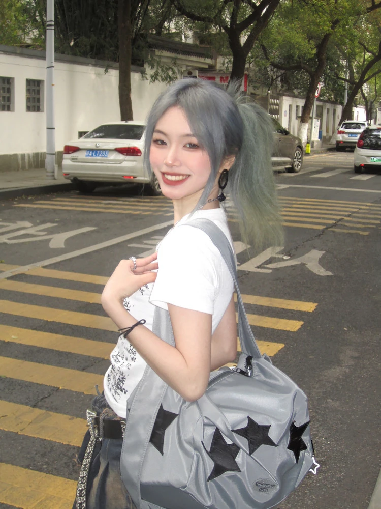 Y2K shoulder bag for women silver star shoulder crossbody nylon large capacity yoga fitness handbag hot girl retro shoulder bag