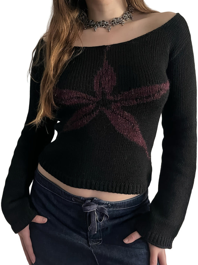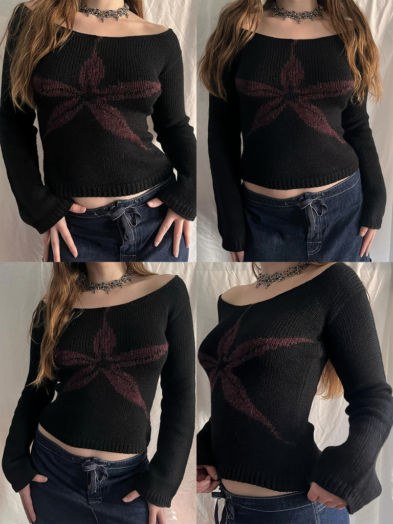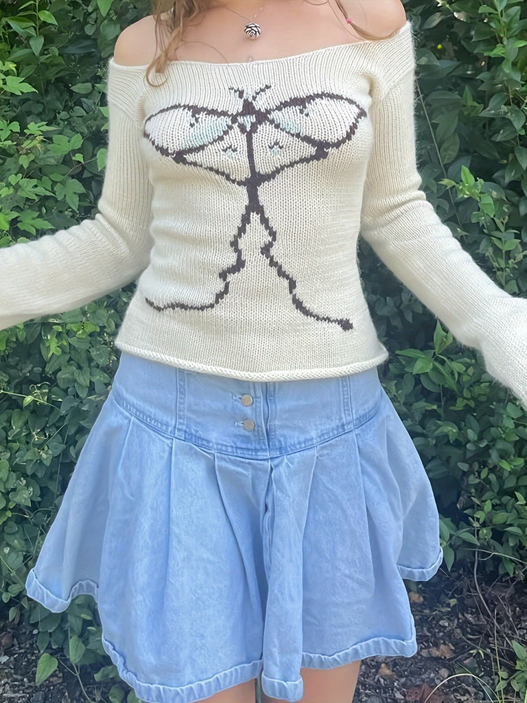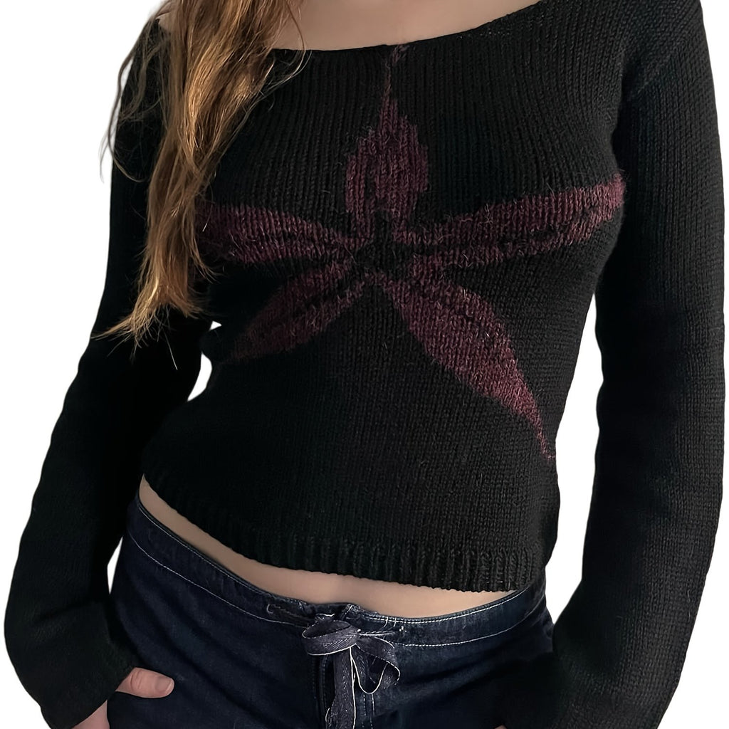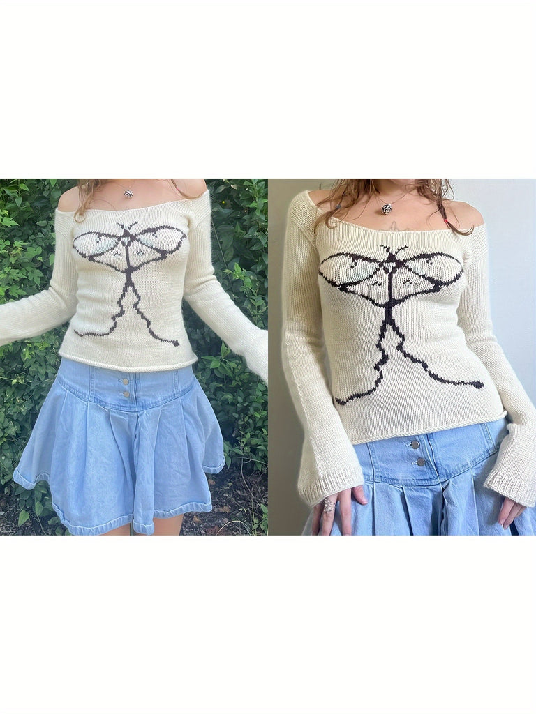 [1pc Elegant Off-Shoulder Sweater] 1pc Elegant Viscose Off-Shoulder Sweater for Women, Solid Color Crew Neck Long Sleeve Knit Top with Graphic Print, Versatile Streetwear for All Seasons