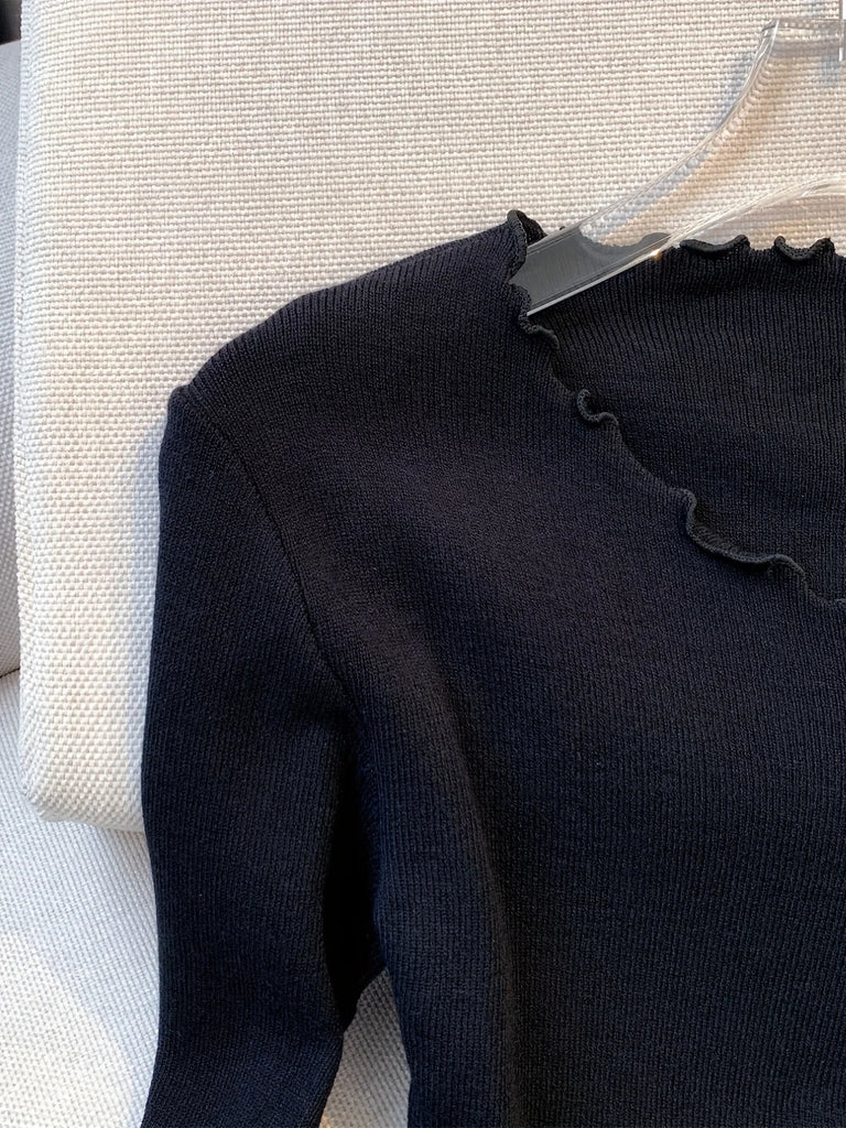 Black/White Solid Lettuce Trim Bowknot Pullover Sweater Y2K Casual Long Sleeve Sweater For Spring & Fall Women's Clothing