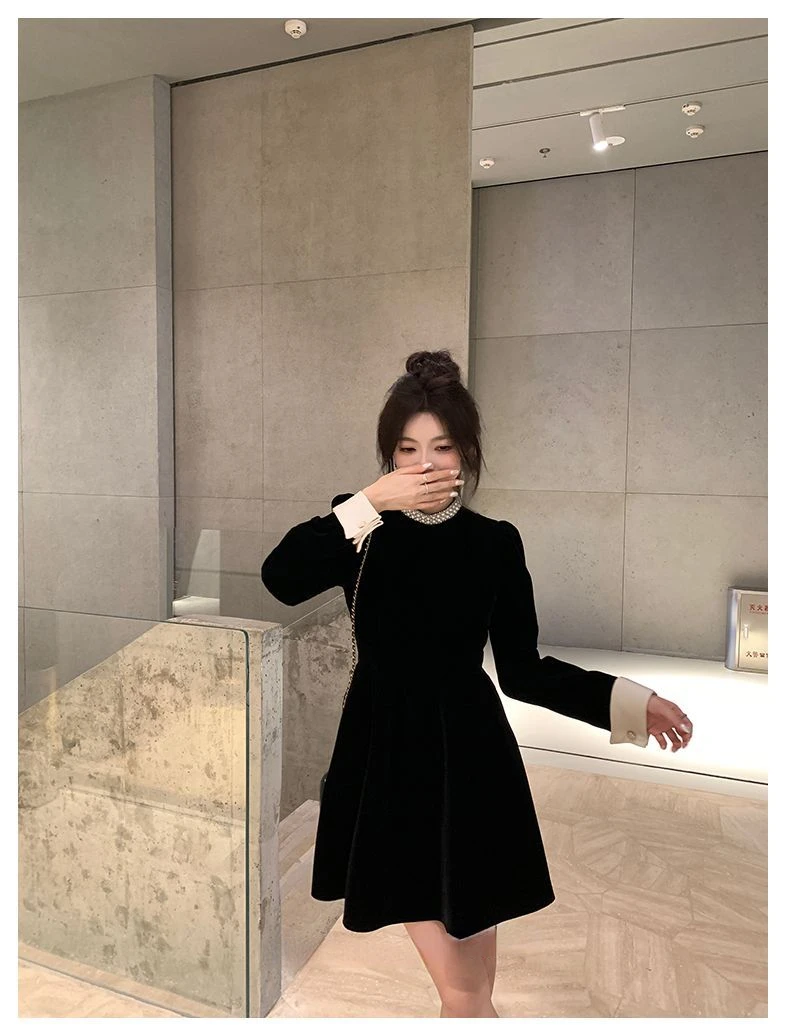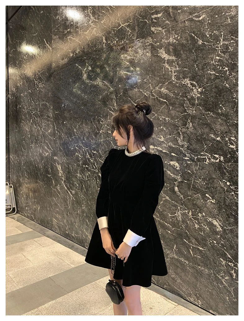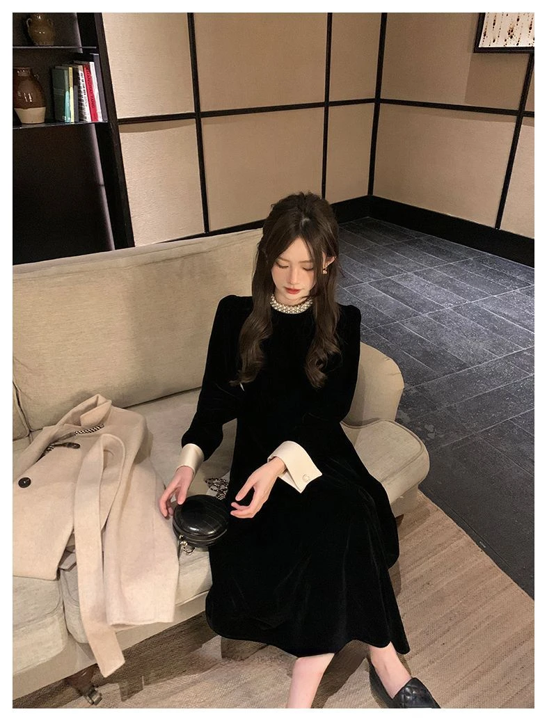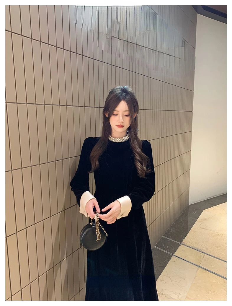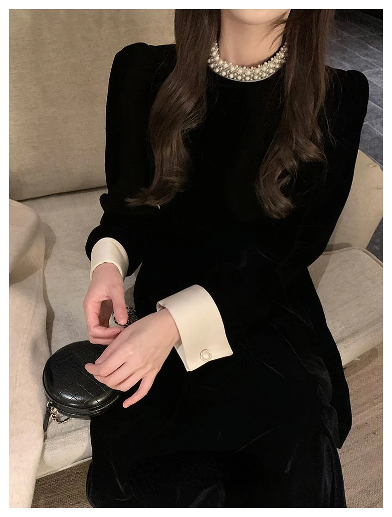 Sweet Woman Party Dresses Korean Vintage Velvet Black Dress Patchwork Robe Elegant Clothes All Match Pearl Vestidos Mujer