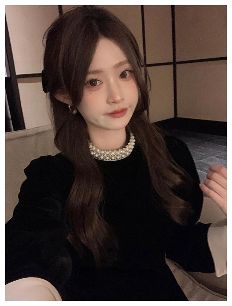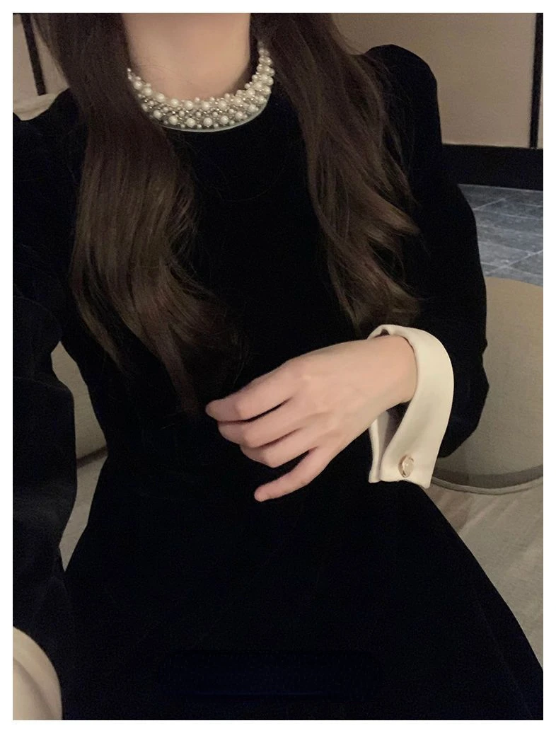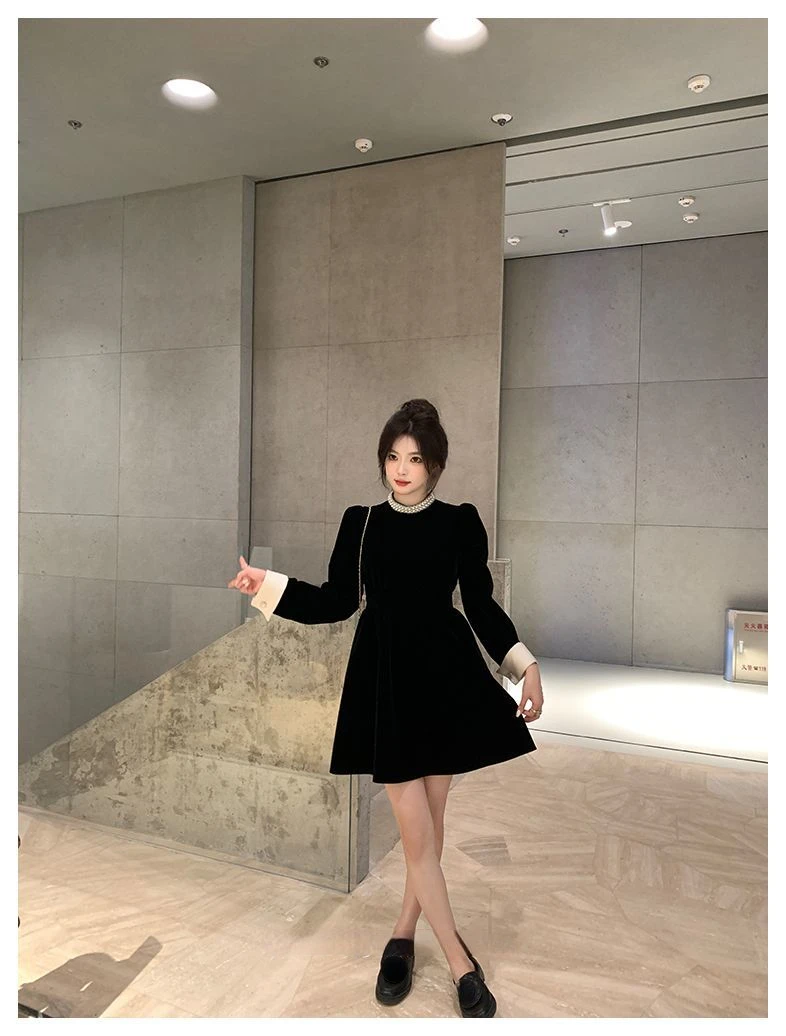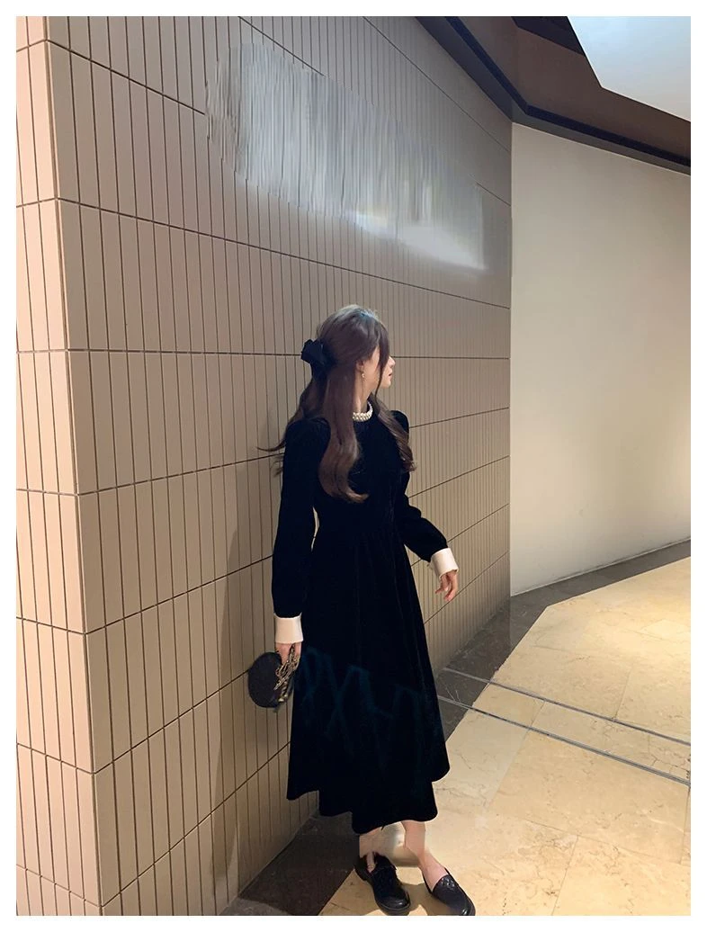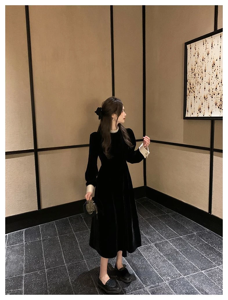 Sweet Woman Party Dresses Korean Vintage Velvet Black Dress Patchwork Robe Elegant Clothes All Match Pearl Vestidos Mujer