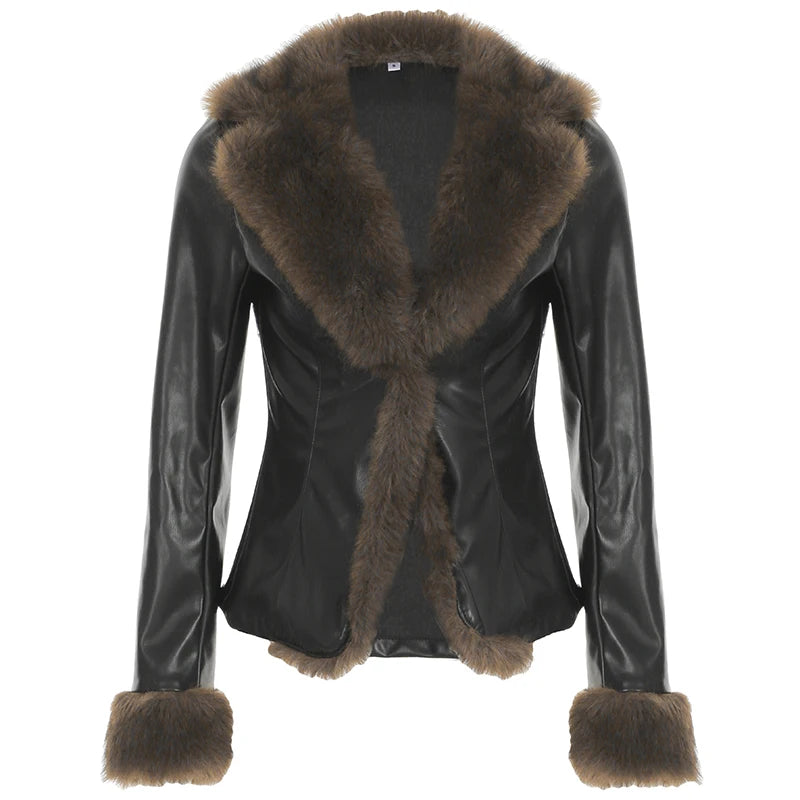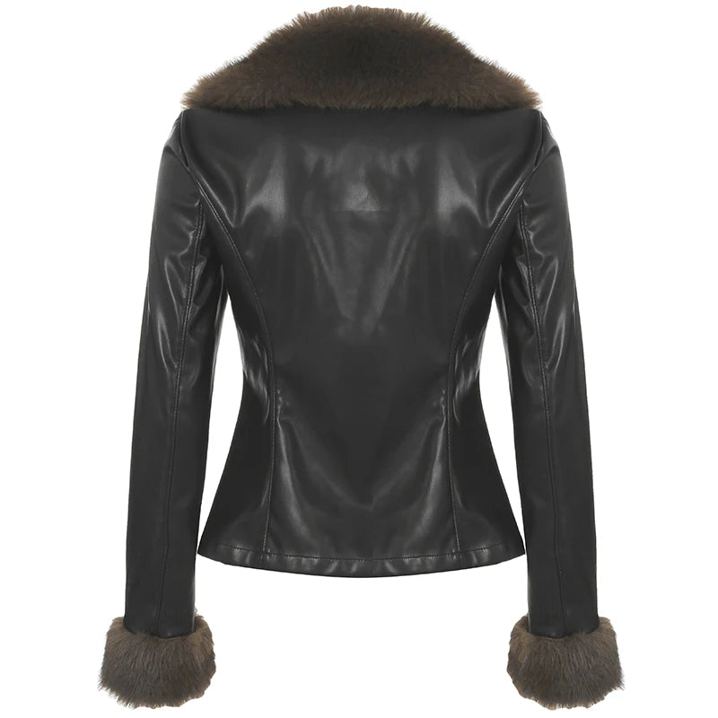 Autumn New Clothes Women’s Leather Coat Long Sleeve Spliced Faux Trim Button Slim Fit Chic Coat