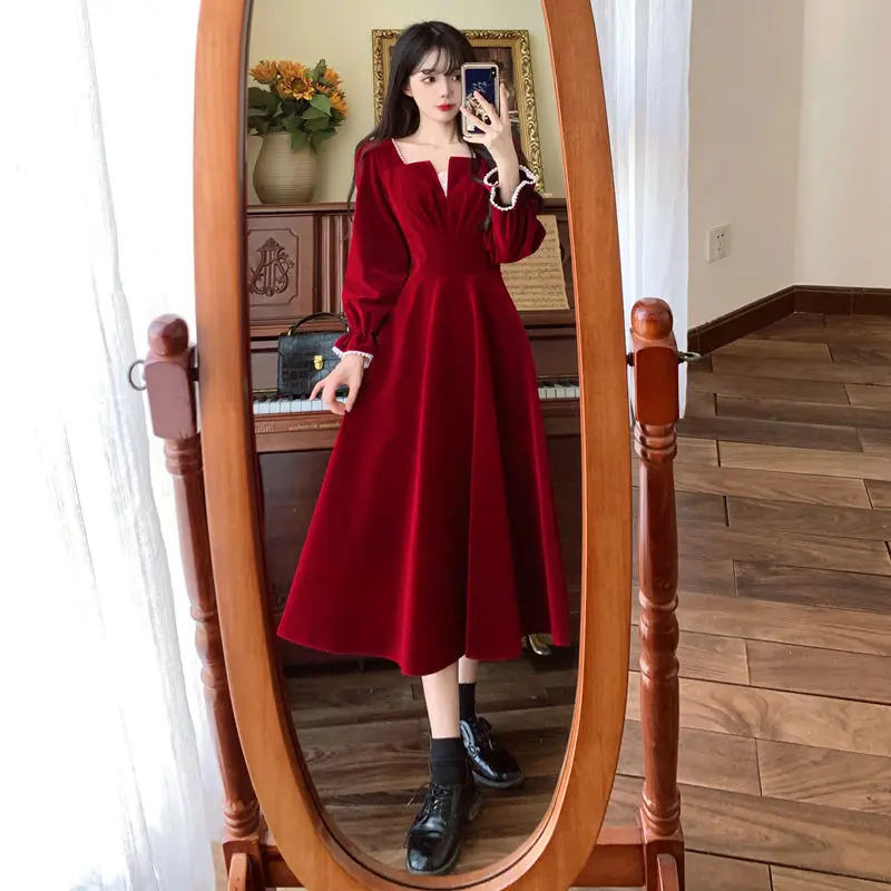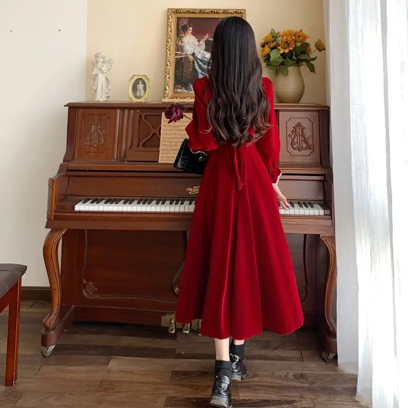 Women Elegant Red Christmes Long Sleeve Party Dress Square Collar A-ling Ruffle Birthday Paty Long Dress Fashion Velvet Dress