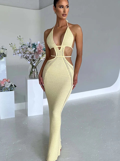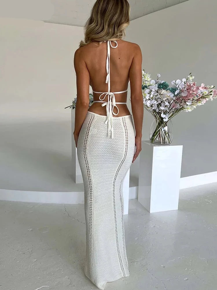 Crochet Halter Sleeveless Backless Solid Hollow Out Bandage Sexy Slim Maxi Prom Dress Winter Festival Party Outfit