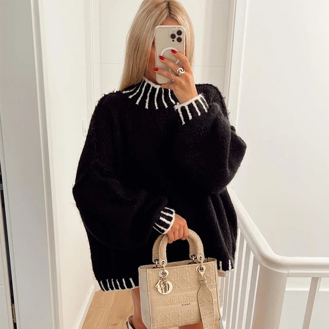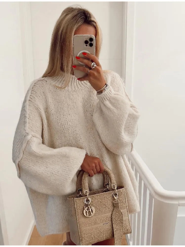 Women Loose Long Lantern Sleeve Pullover Elegant O-neck Thick Knitted Sweater Autumn Fashion Solid Casual Street Lady Top