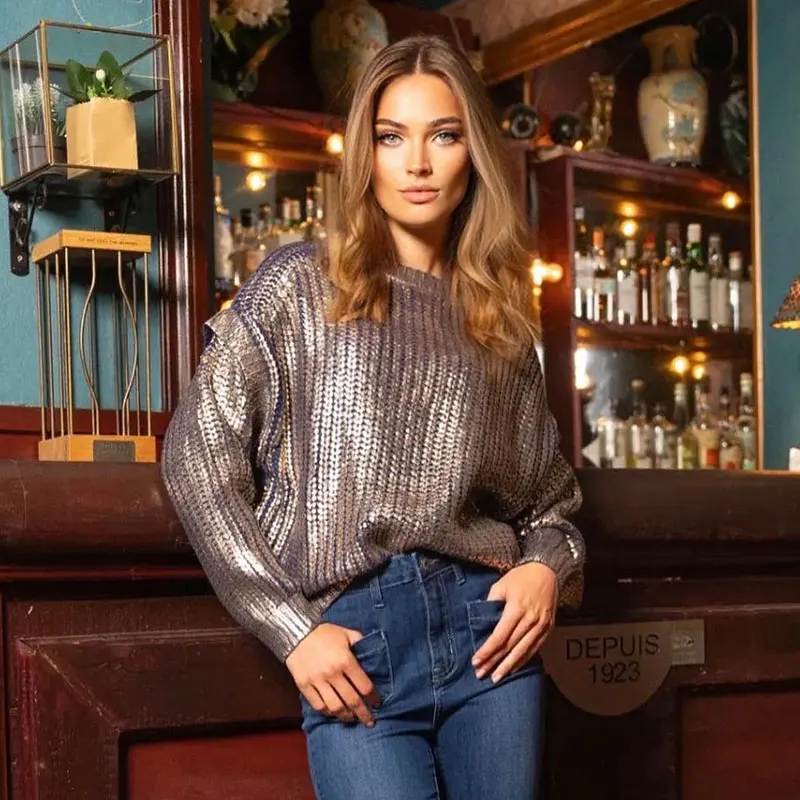 Low-cut V Neck Metallic Color Pullover Women Long Sleeve Warm Knitted Sweater Autumn Winter Chic Office Ladies Knitwear
