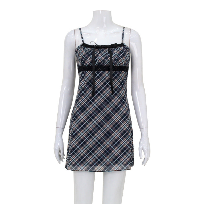 spring new sweet fresh plaid suspenders sexy lace stitching dress A-line short skirt