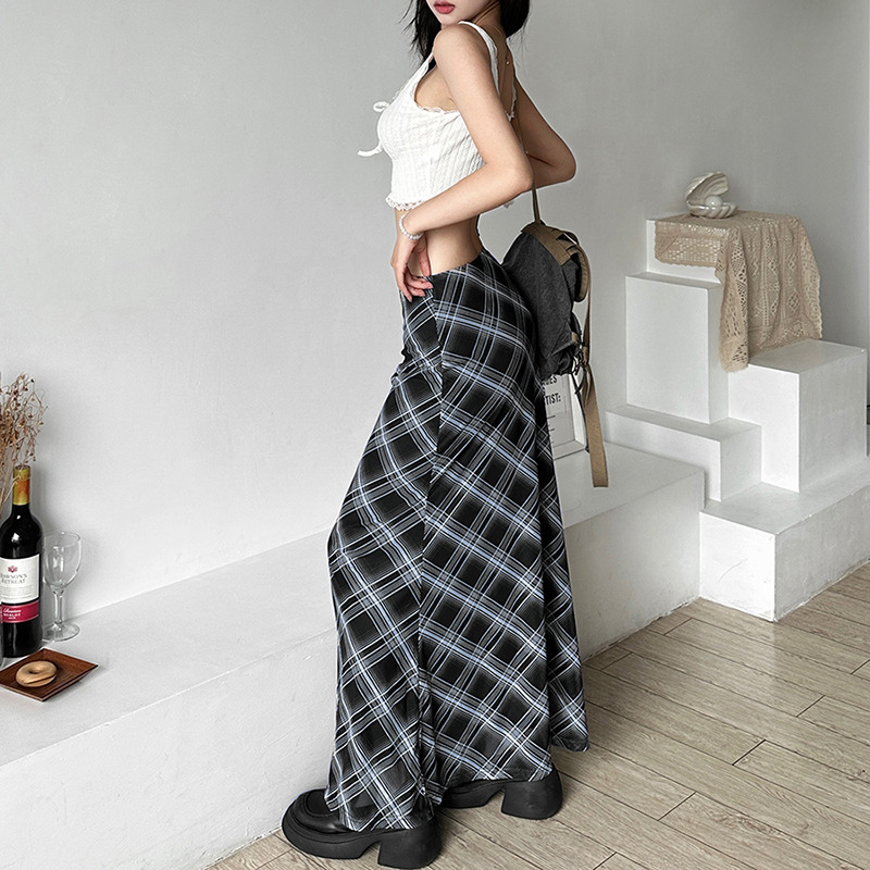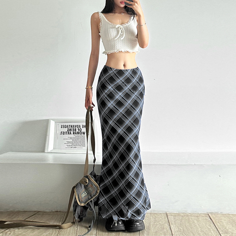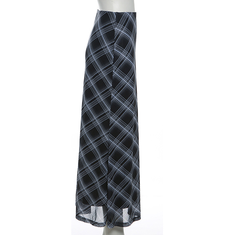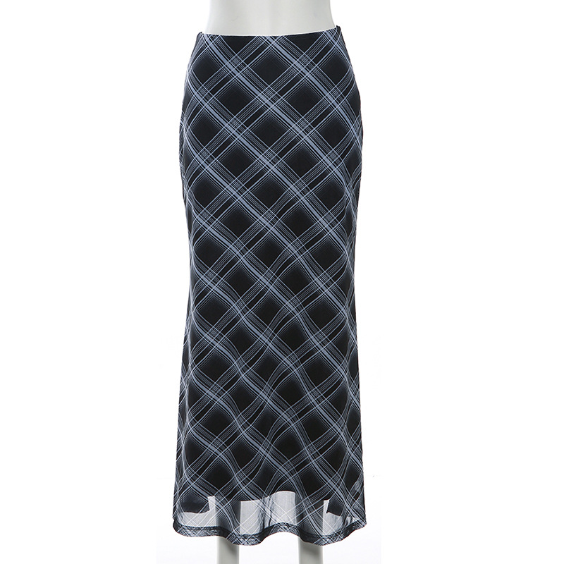 Aesthetics Retro Plaid Print Mesh Long Skirts Y2K Vintage 90s Low Waist Double Layer Straight Midi Skirt Korean Fashion Clothes