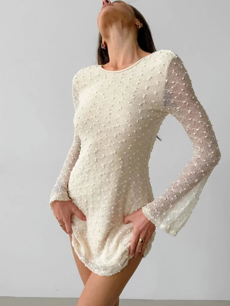Apricot Sexy Slim Fit Round Neck Lace Up Jacquard Short Dress Fashion Chic Flare Sleeve Backless Sexy Women Dress 2025 New
