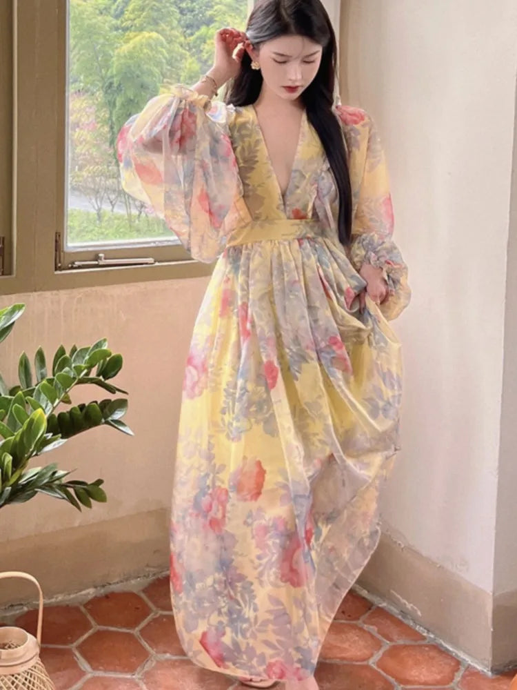 Autumn Elegant Women Floral Midi Dress Long Sleeve Vintage Party Birthday Vestidos Female A-Line Mujers Fall Clothes New