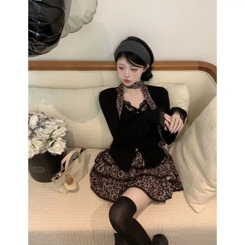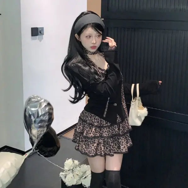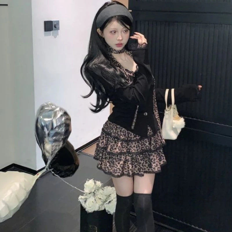 Autumn Winter American Streetwear Vintage Shirts Y2k Harajuku Japan Slim Waist A Line Patchwork Lace Tiered Skirts Girl Sets