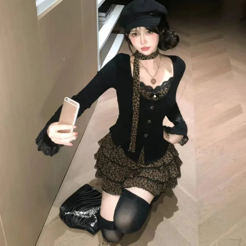 Autumn Winter American Vintage Spliced Girl Tops with Scarf Japan High Street Y2k Aesthetic Tiered Skirt Harajuku Punk Moda Sets
