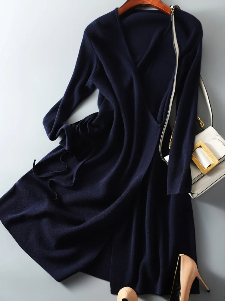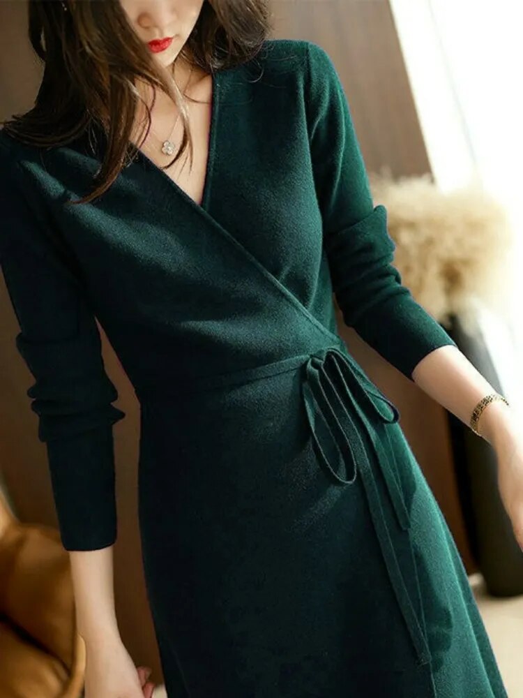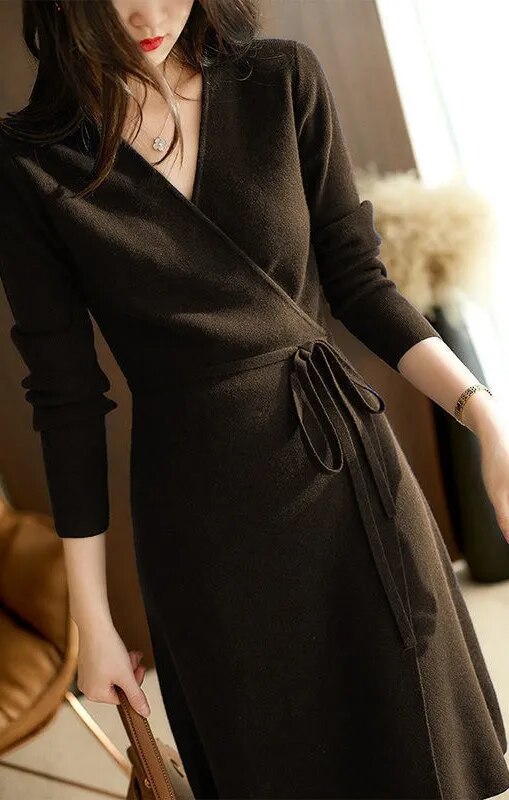 Autumn/Winter Women's V-neck Lace Up Wrap Up Dress New Korean Version Loose and Elegant Commuter Style Knitted Dress