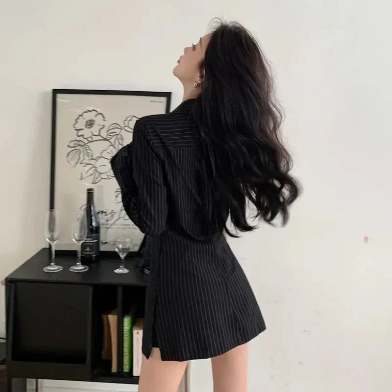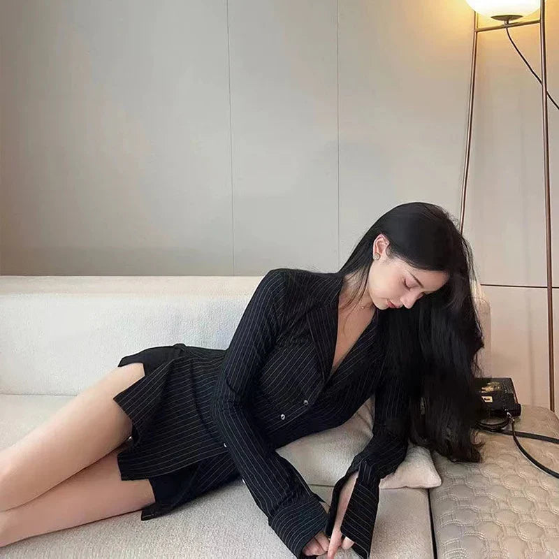 Black Striped Long Sleeve Blouses Women Korean Sexy V-Neck Slim Casual Shirts Y2K Fashion Elegant Office Lady All-match Midi TopI