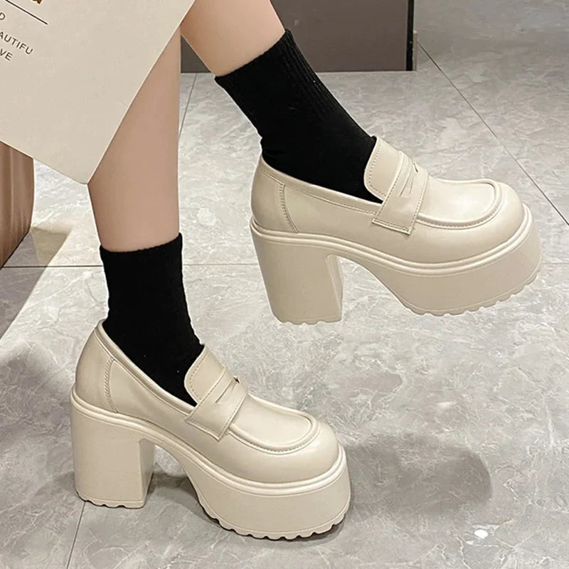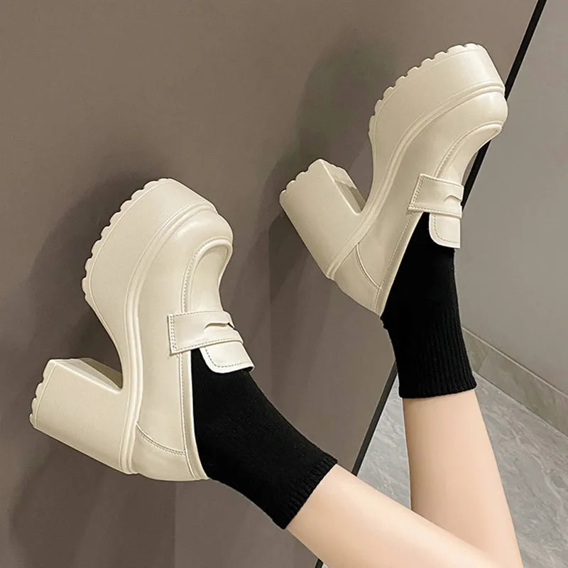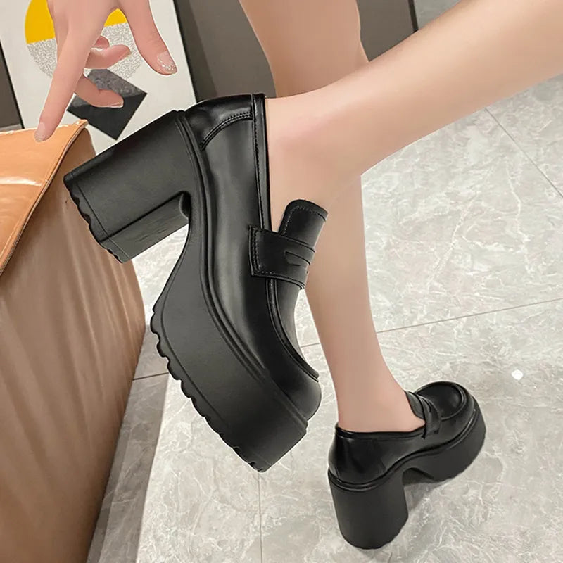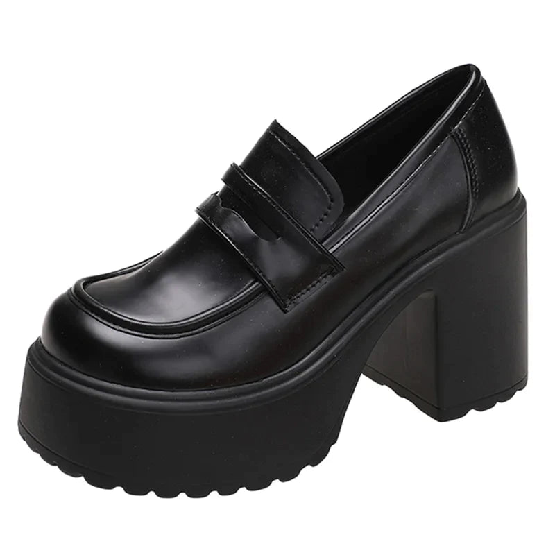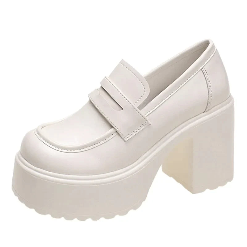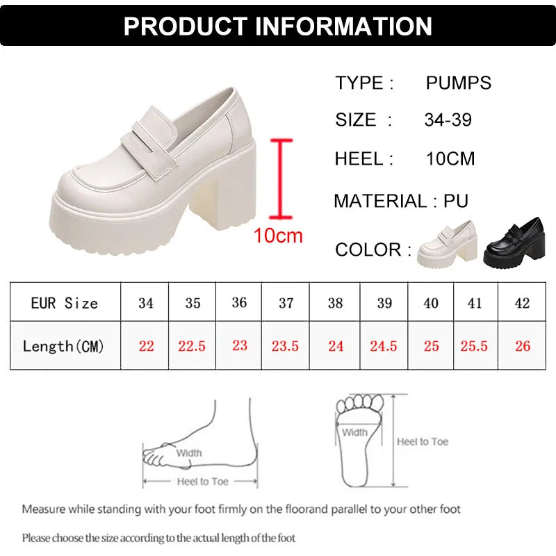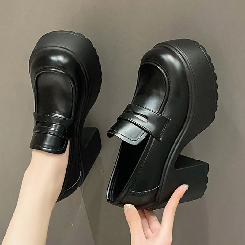 Black White Chunky Platform Loafers Women Autumn Thick High Heel Pumps Woman Slip On Pu Leather Goth Shoes Female