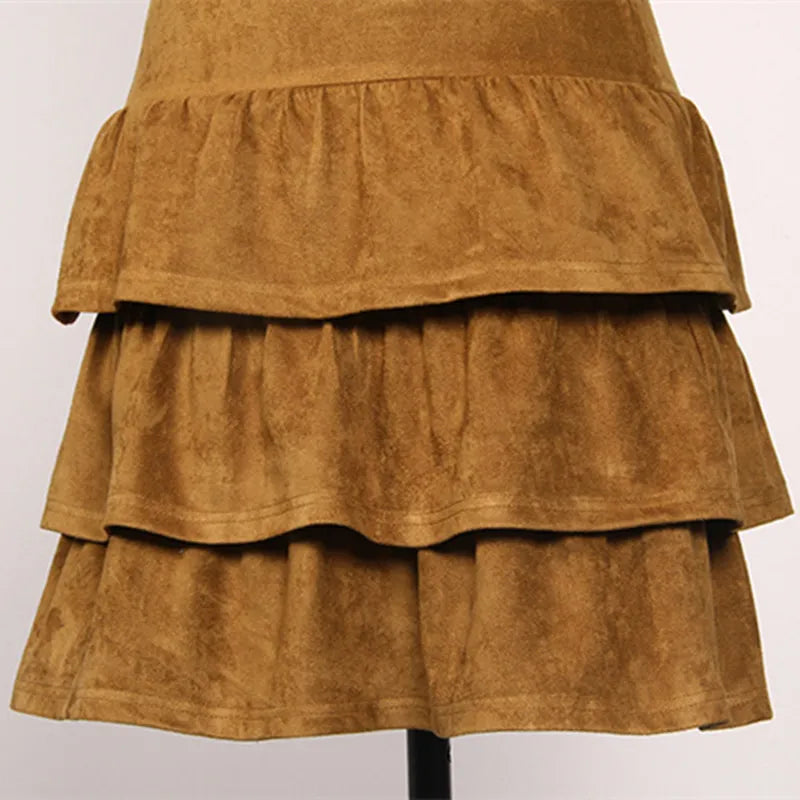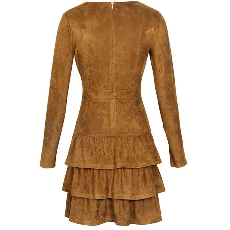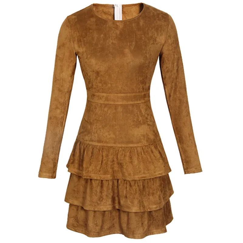 BornToGirl Women Spring Autumn Winter Vintage Casual Thick Long Sleeve O Neck Slim High Waist Black Brown Suede Cake Dresses